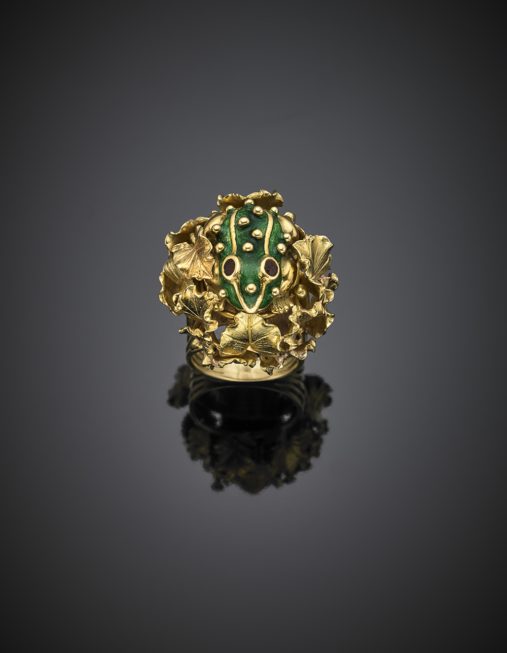 Yellow gold full relief leaf ring with green enamel frog, small ruby for the eyes, g 39.13 size 17/57. Marked P.A.P., 18.