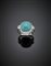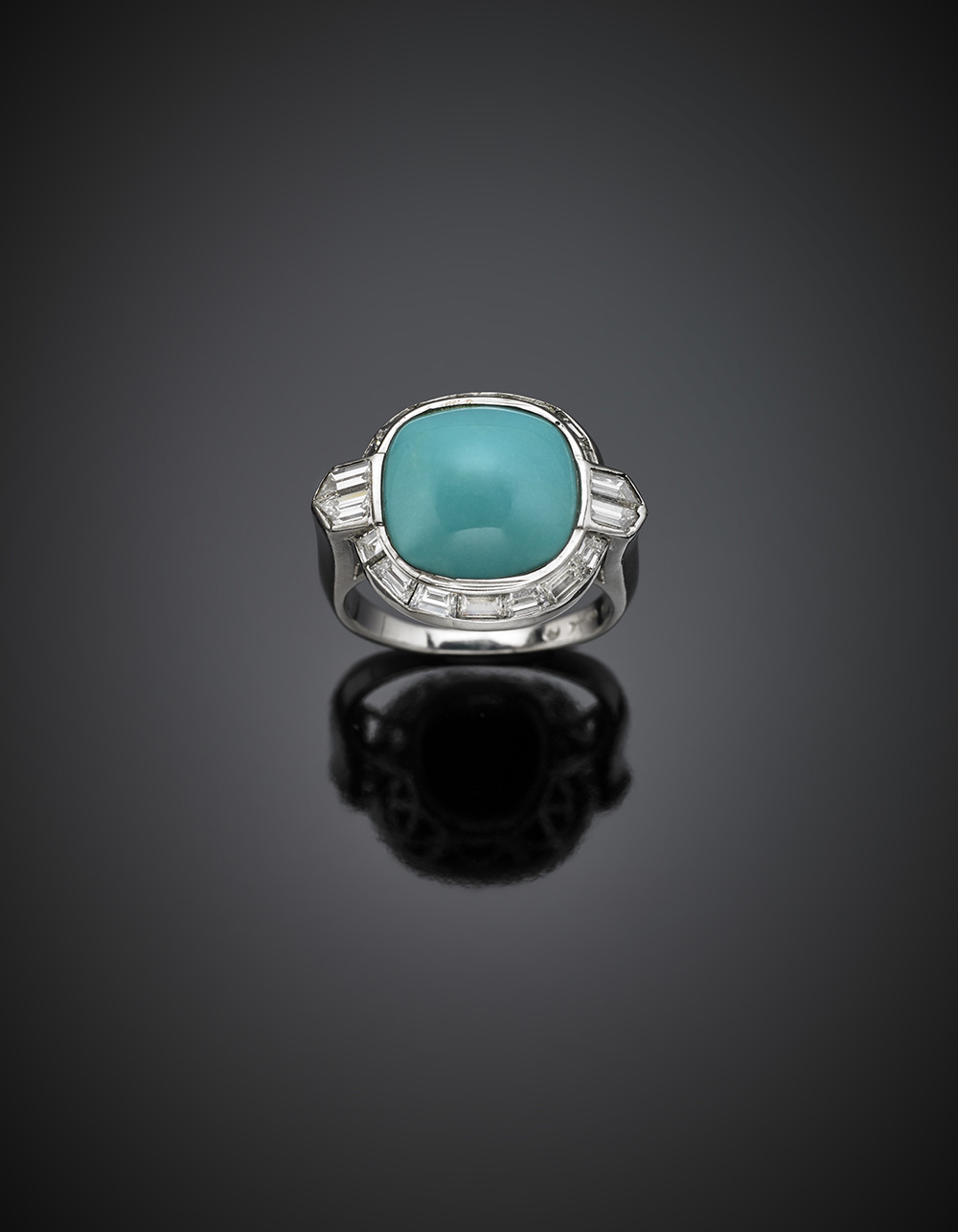 Turquoise sugar loaf and calibré diamond platinum ring, in all ct. 1 circa, g 7.12 size 15/55. Marked HW. Originally it mounted a different stone
