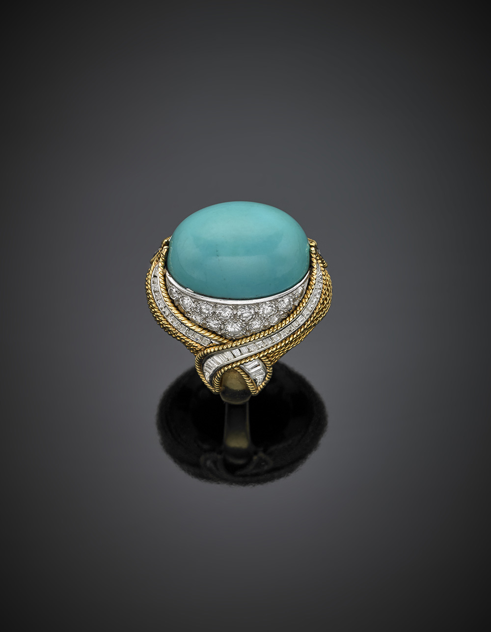 Anello a cupola in oro giallo e bianco con turchese cabochon di mm 21,79x15,81, rifinito con pavé di diamanti rotondi e nastri a baguette per complessivi ct. 3,50 circa, g 22,67 misura 10/50.