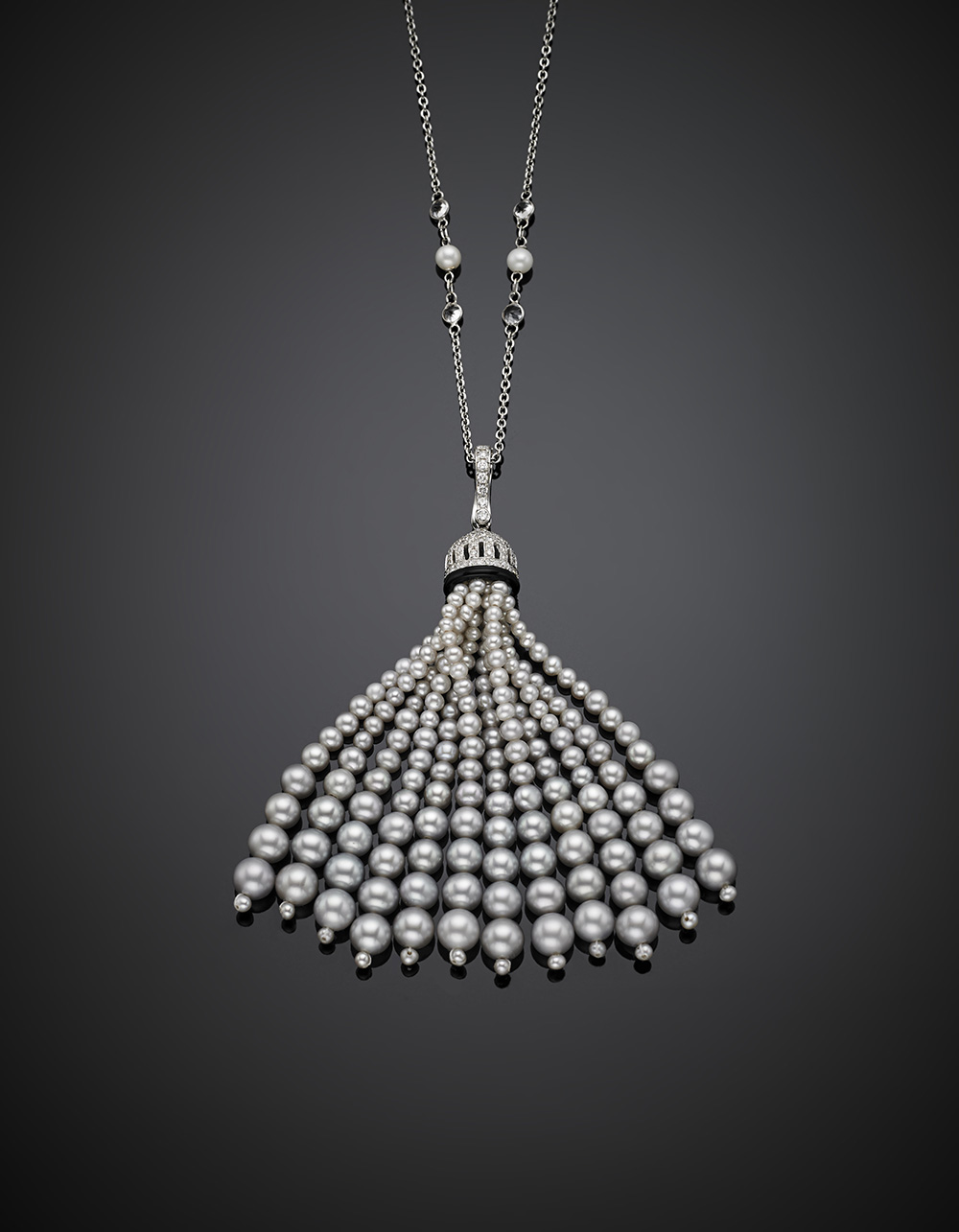 Sautoir in oro bianco, topazi e perle, pendente con diamanti per complessivi ct. 0,50 circa e onice a tenere una nappa di perle grigie e bianche a scalare, g 21,95, lungh. cm 95 circa.