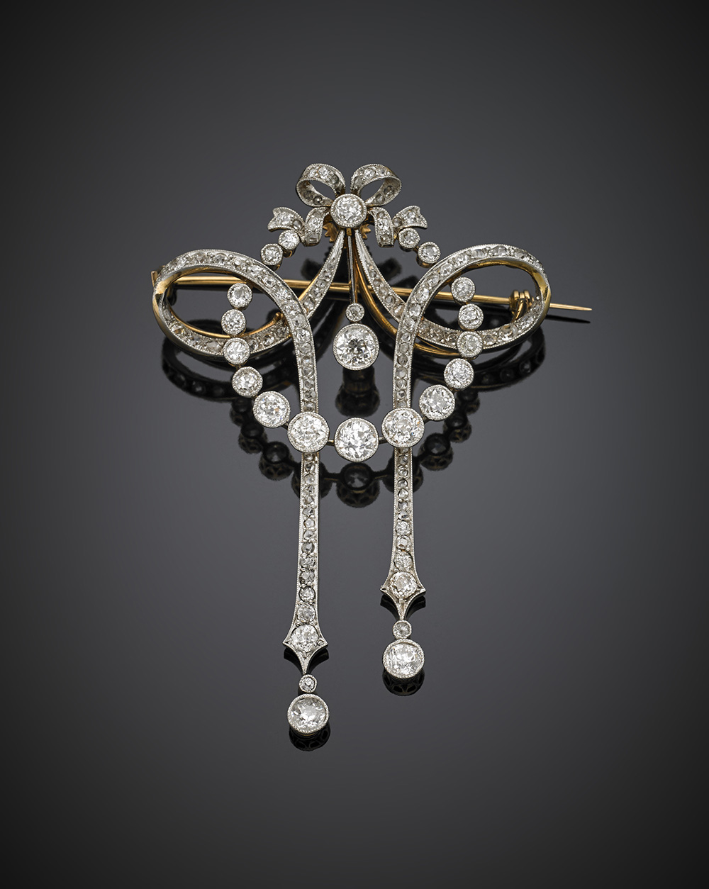 Spilla a volute e nastri in oro giallo e bianco con diamanti rotondi per complessivi ct. 4 circa, g 21,13, lungh. cm 6,70 , largh. cm 5,20 circa.