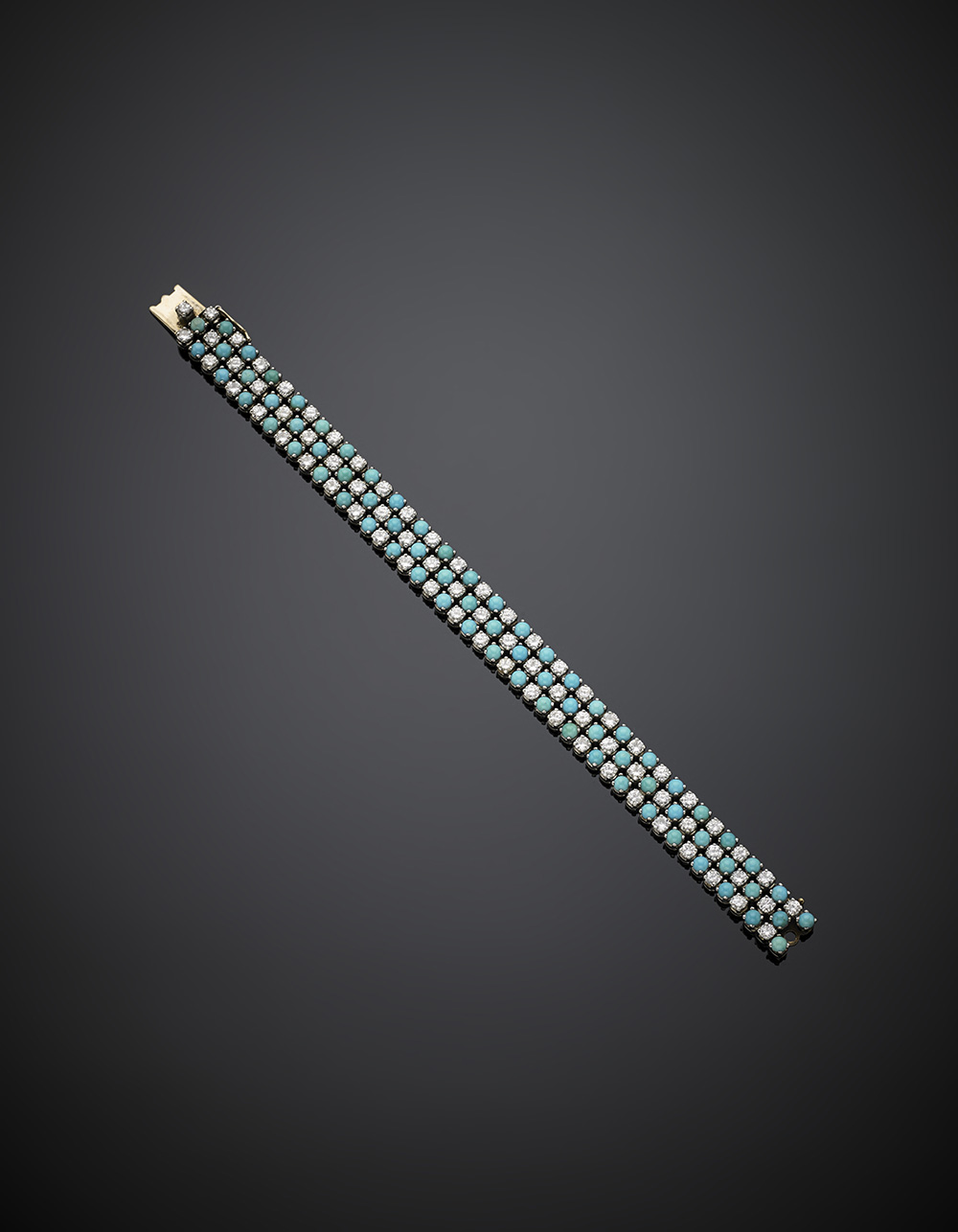 Bracciale a fascia in oro bianco turchesi e diamanti rotondi per complessivi ct. 7,20 circa, g 36,02, lungh. cm 16,50 circa. Firmato Chantecler Capri. In scatola Chantecler Capri accompagnata da fattura originale d'acquisto