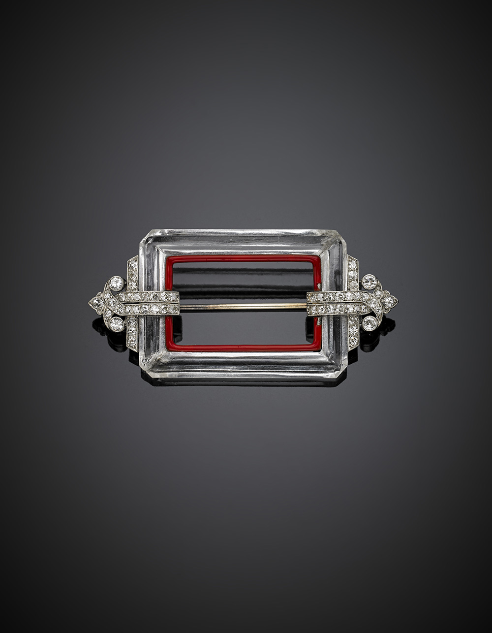Hyaline quartz, diamond, platinum and white 14K gold brooch, red enamel details, g 14.59, length cm 5.7 circa. (defects)