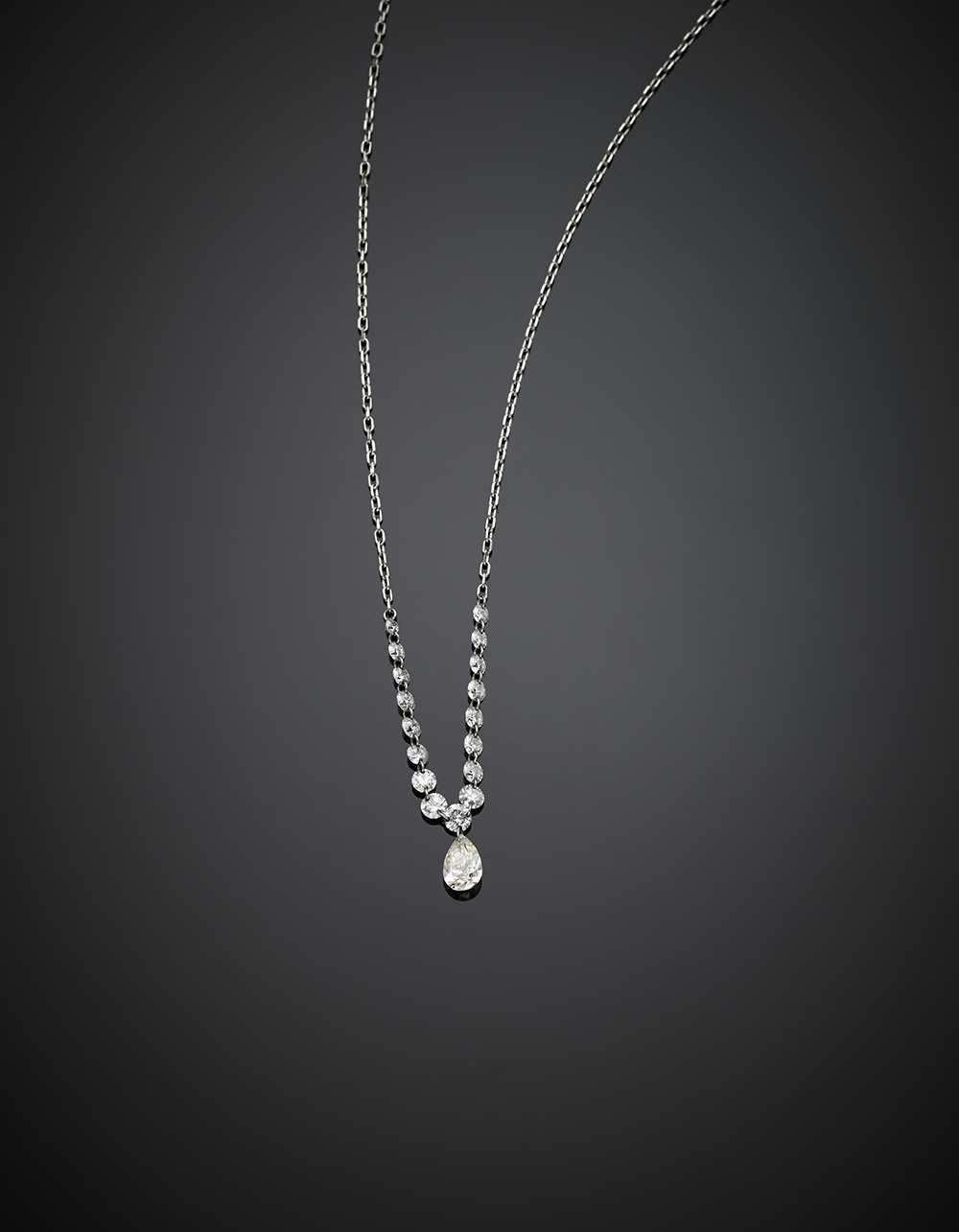 Catenina in oro bianco con centrale in diamanti rotondi a scalare a tenere un diamante a goccia, per complessivi ct. 1 circa, g 1,94, lungh. cm 45 circa.