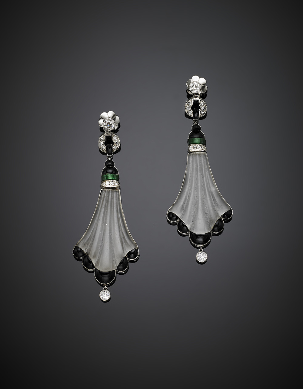 Orecchini pendenti in platino, onice e vetro satinato scolpiti e rifiniti con diamanti per complessivi ct. 1 circa a rifinirli, dettagli in smeraldi e oro bianco, g 18,74, lungh. cm 7,5 circa.
