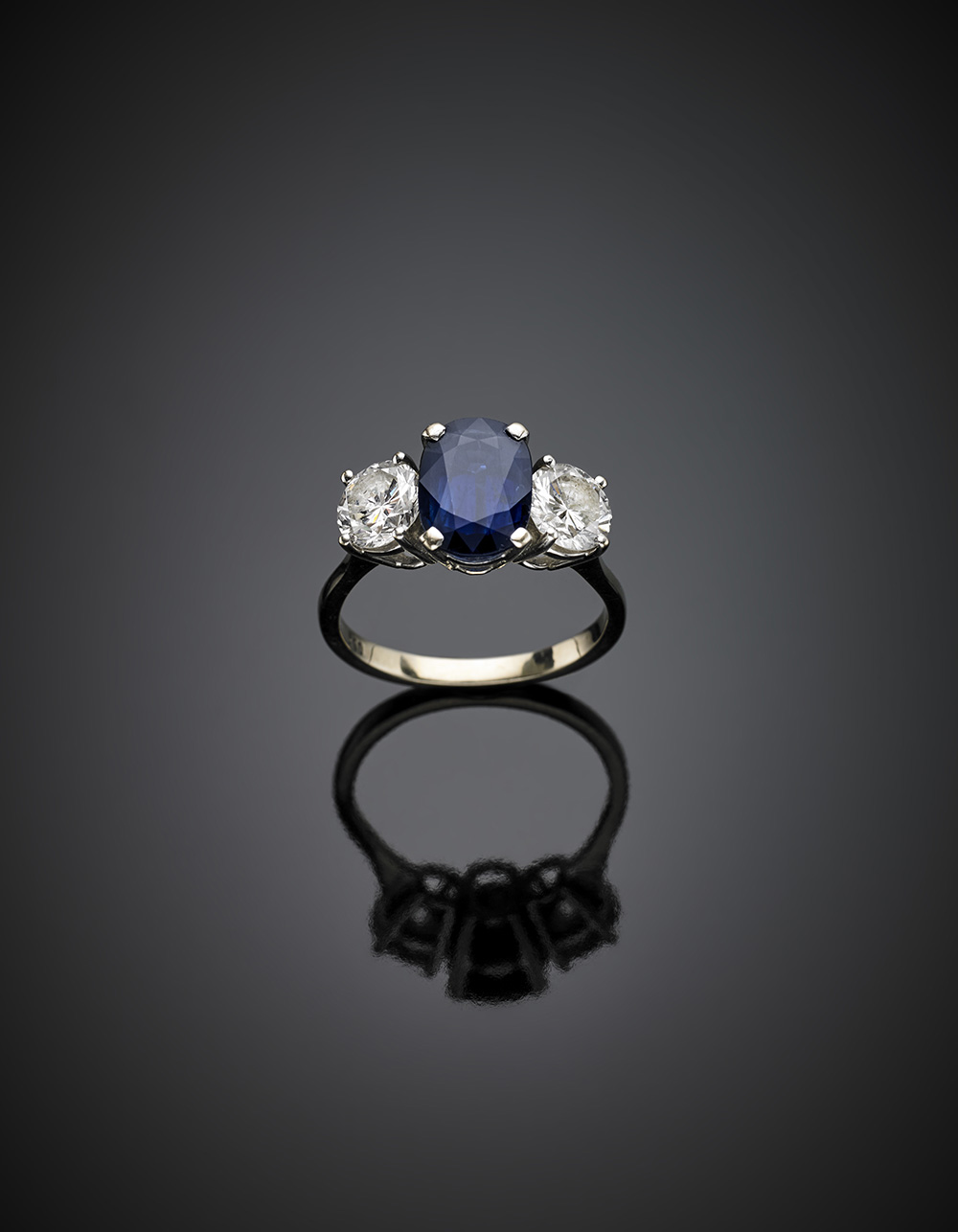 Anello in oro bianco con due diamanti rotondi per complessivi ct. 2 circa e al centro uno zaffiro ovale di ct. 3,40 circa g 5,05 misura 14/57. In scatola Eredi Spallanzani, Milano