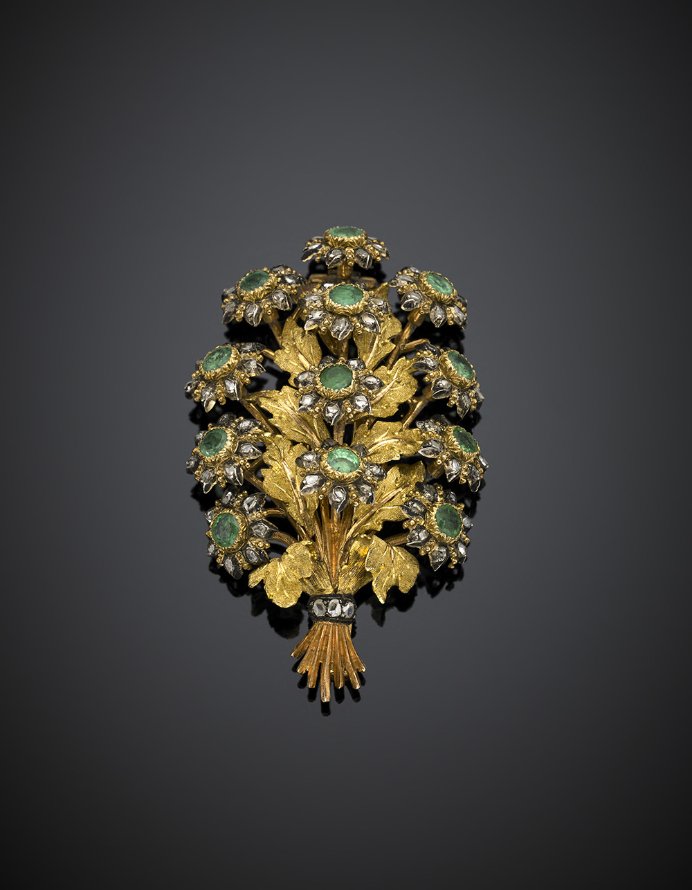 Broche in oro cesellato giallo, rosa e argento a guisa di mazzo di fiori con smeraldi rotondi per complessivi ct. 1,80 circa, piccoli diamanti a mezza rosetta a rifinirla, g 16,05, lungh. cm 5, largh. cm 3,10 circa. Firmato M. Buccellati.