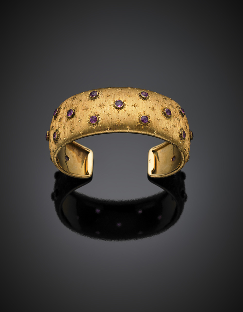 BUCCELLATIBracciale rigido alla schiava in oro giallo cesellato e rubini, g...