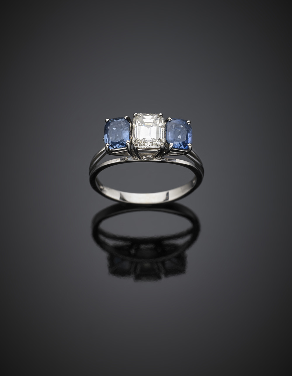 Anello in oro bianco con un diamante centrale rettangolare di ct. 1,33 circa e due zaffiri per complessivi ct. 2 circa ai lati, g 3,60, diam. cm 17/57.