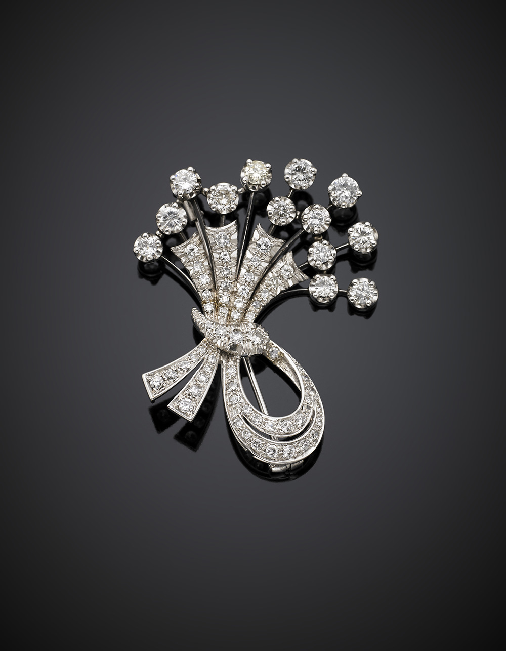 Spilla in oro bianco e diamanti rotondi per complessivi ct. 3,50 circa a guisa di fiori e nastri, g 15,33, lungh. cm 5, largh. cm 4 circa.