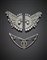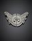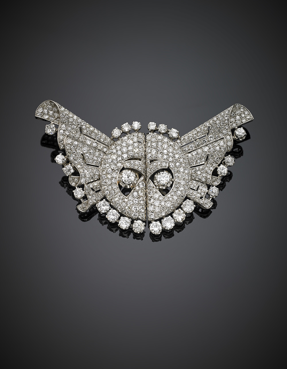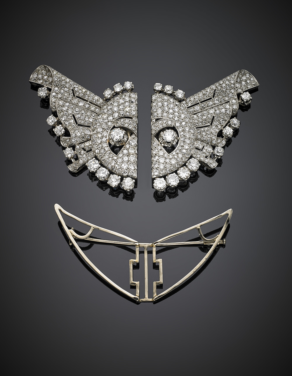 Broche in platino e oro bianco divisibile in due clip a guisa di nastri e coccarde, per complessivi ct. 17 circa g 46,05, lungh. cm 8,60, largh. cm 5,30 circa. (mancanze)