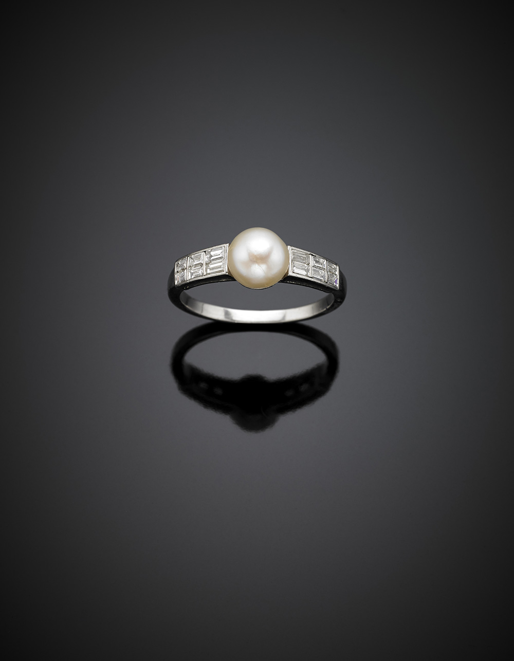 Natural saltwater mm 7.2 ca. pearl and diamond baguette platinum ring, g 4.55 size 20/60.