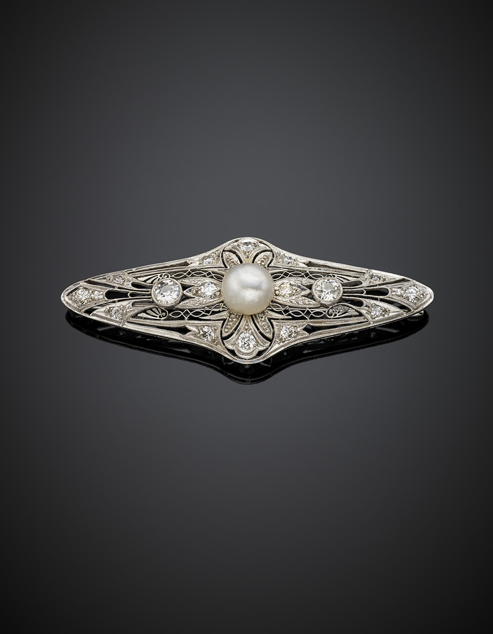 Broche traforata in oro bianco con diamanti rotondi per complessivi ct. 1,60 circa e al centro una perla bianca