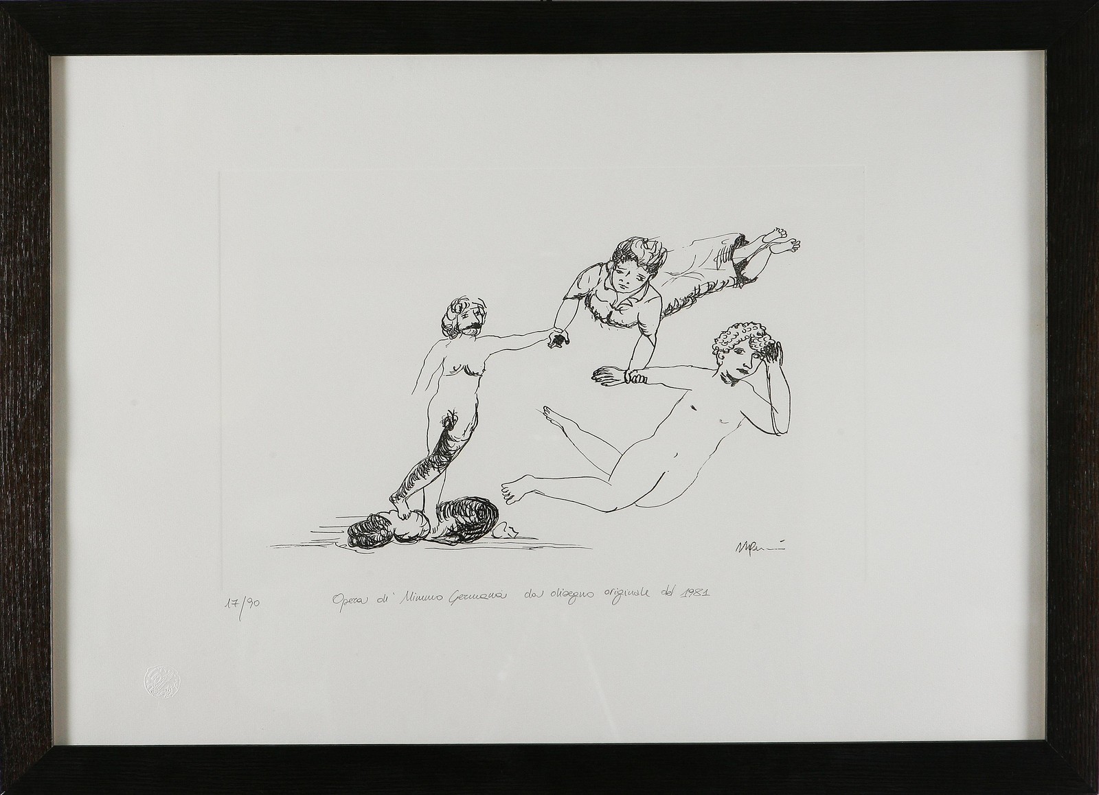 GERMANA' MIMMO (1944 - 1992) Senza titolo. Litografia. Cm 69x49. Tir. 17/90 a matita in basso a sinistra; da disegno originale del 1981; misure disegno: 29,5x45; timbro a secco in basso a sinistra Pegaso Edizioni D'arte. Firma a matita in basso al centro. Cornice presente.
