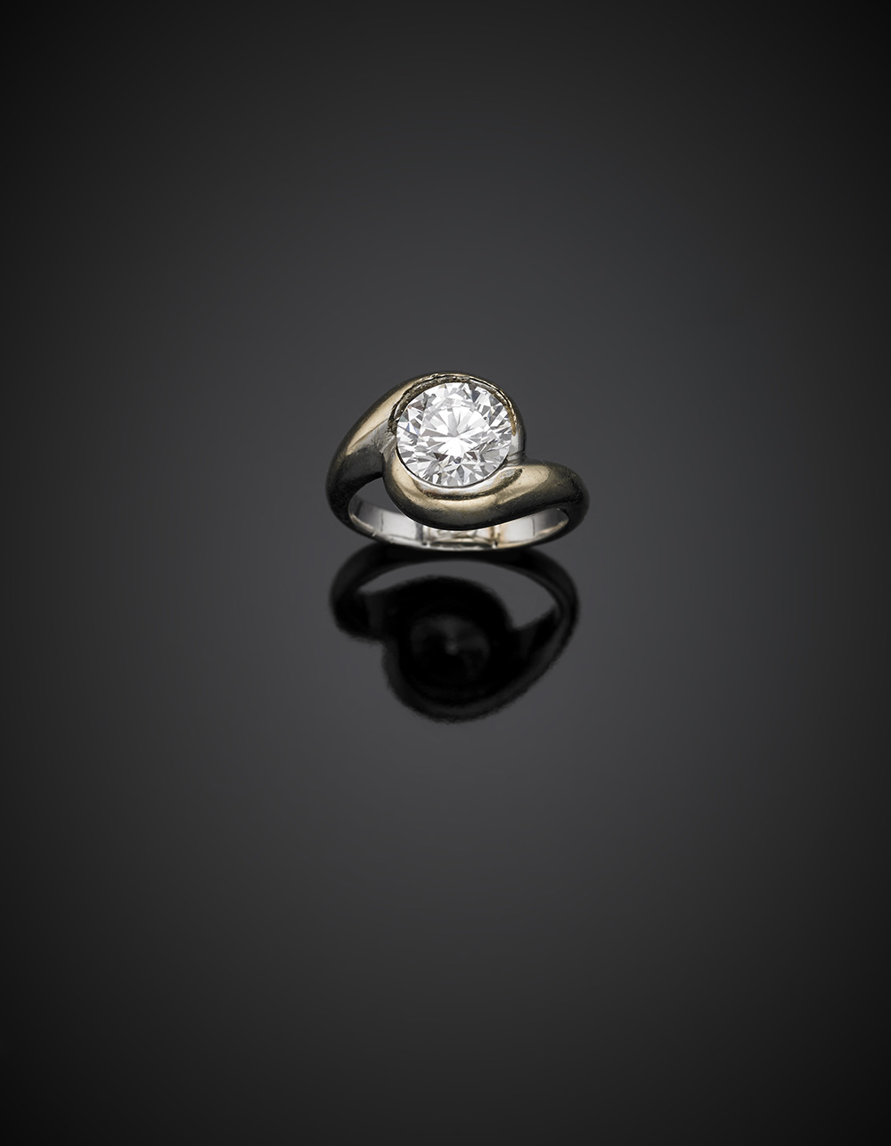 Anello in oro bianco con diamante rotondo taglio a brillante di ct. 2,04, g 7,52 misura 9/49.