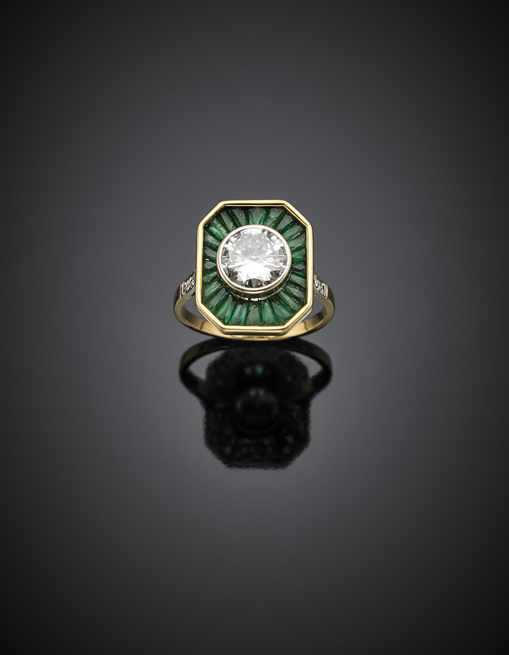 Lot 942 | Anello in oro giallo con diamante rotondo di ct. 2,20 circa e smeraldi...