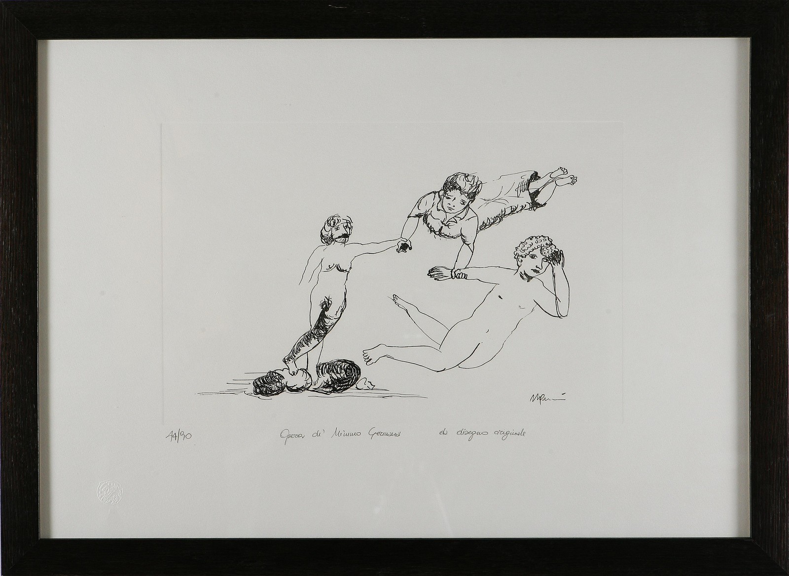 GERMANA' MIMMO (1944 - 1992) Senza titolo. Litografia. Cm 70x50. Tir. 44/90 a matita in basso a sinistra; da disegno originale del 1981; misure disegno: 29,5x45; timbro a secco in basso a sinistra Pegaso Edizioni D'arte. Firma a matita in basso al centro. Cornice presente.