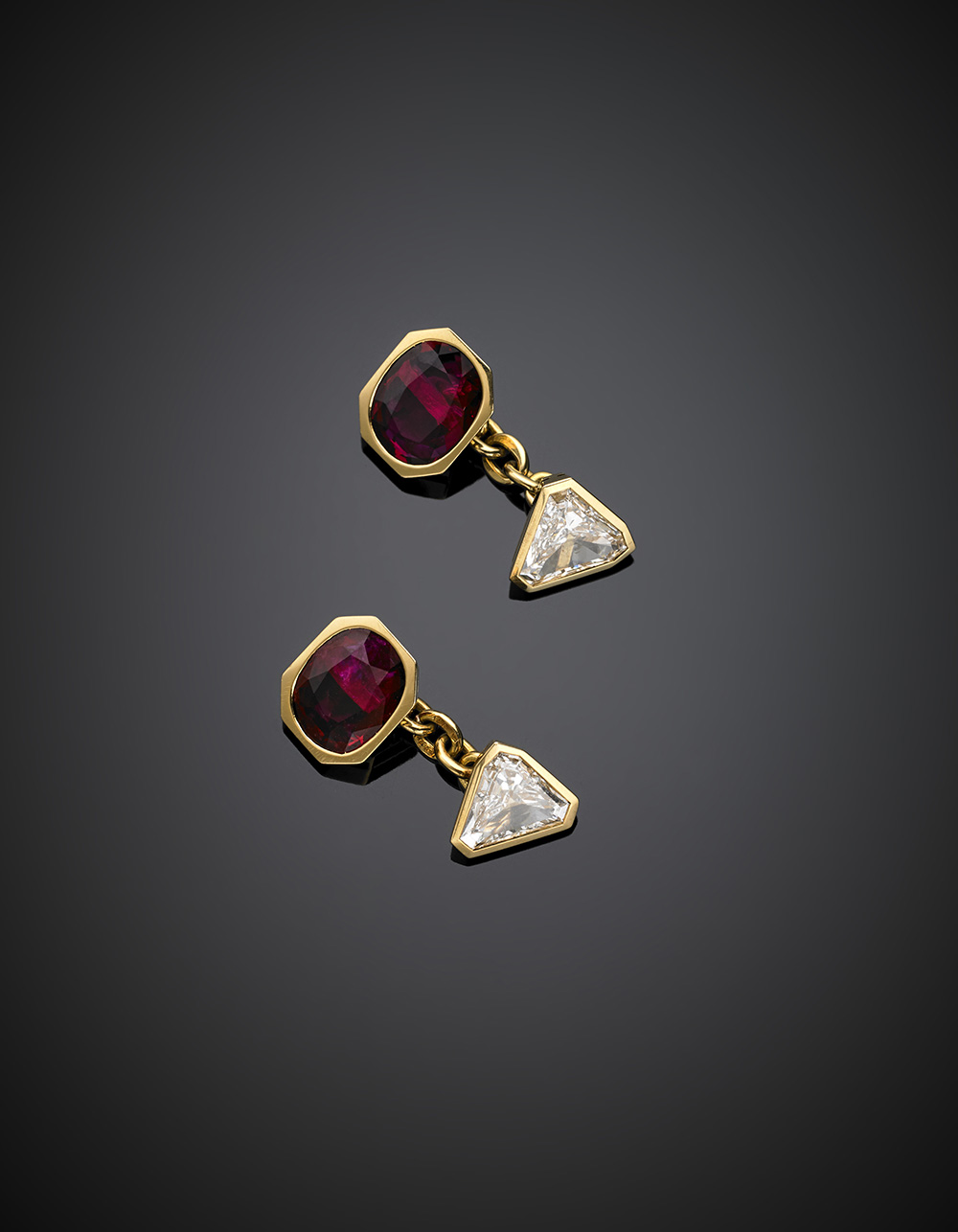 Yellow gold diamond and ruby cufflinks with two triangular ct. 1.2 circa and ct. 1.3 circa diamonds combined with two ct. 1.98 and ct. 2.05 ca. oval rubies, g 8.73, h cm 1 circa. In Fasano Torino case
