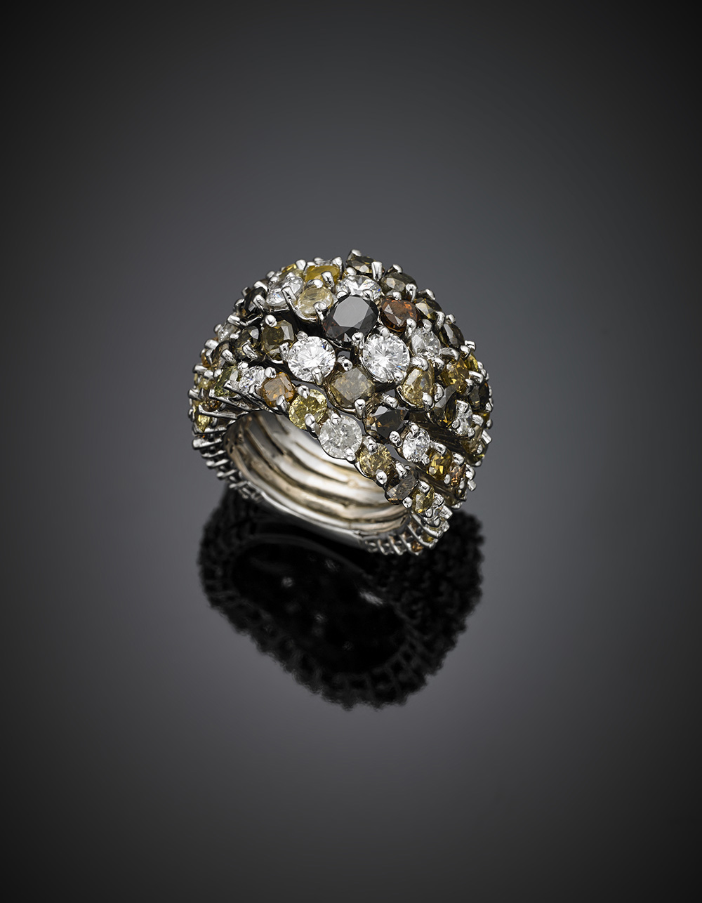 Anello in oro bianco a fascia con diamanti gialli, verdi, brown, neri e incolori, per complessivi ct. 7 circa g 15,09 misura 11/51.