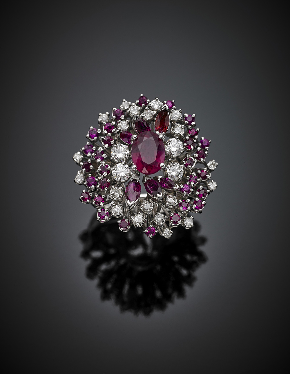 Anello in oro bianco con diamanti e rubini, diamanti per complessivi ct. 1,50 circa e rubini per complessivi ct. 2,50 circa g 15,78 misura 16/56.