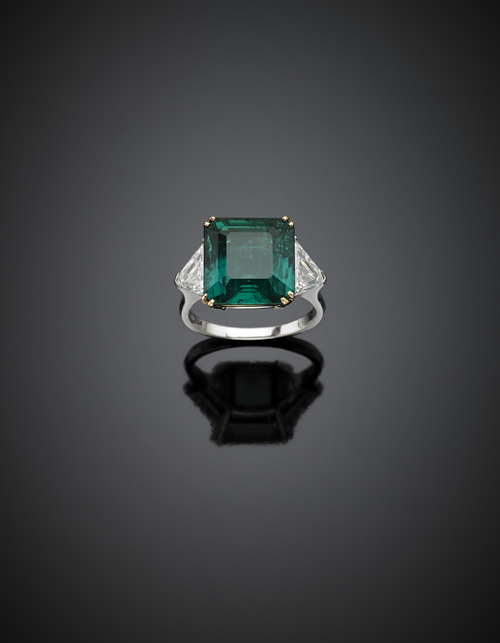 Anello in oro giallo e platino con due diamanti triangolari di ct. 0,71 circa e di ct. 0,73 circa ai lati di uno smeraldo