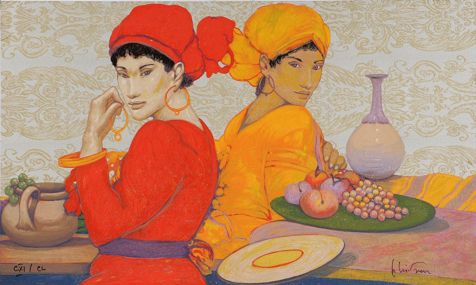 CIVITARESE GOFFREDO (n. 1936) Figure con natura morta. Serigrafia polimaterica su stoffa damascata. Cm 100x60. Tir. CXI/LL in basso a sinistra. Firma in basso a destra.