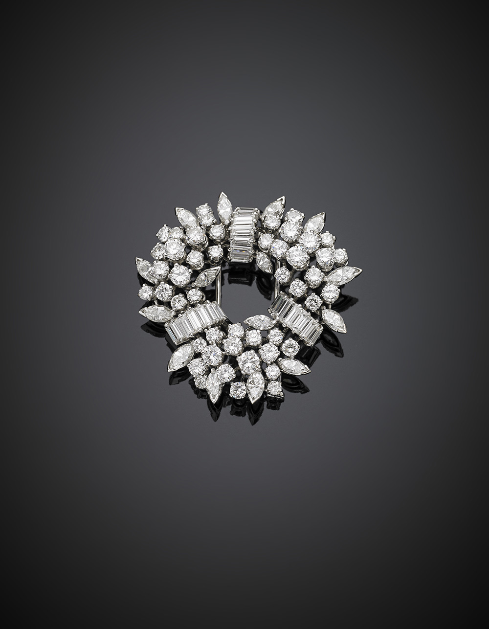 Spilla in oro bianco e diamanti a guisa di ghirlanda, per complessivi ct. 6,50 circa, g 15.70, diam. cm 4. In scatola Missiaglia