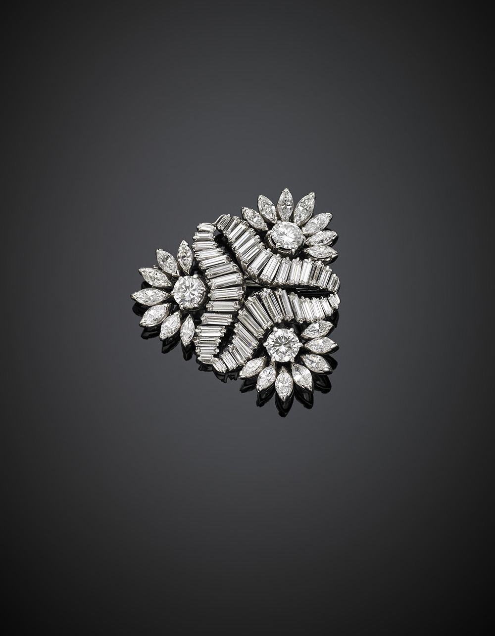 Spilla in platino e diamanti tapered, navette, baguette e tre rotondi per complessivi ct. 10 circa g 17,25, diam. cm 3,7. Marcato 282 MI. Con Expertise e scatola originale della ditta Cavalleri Milano