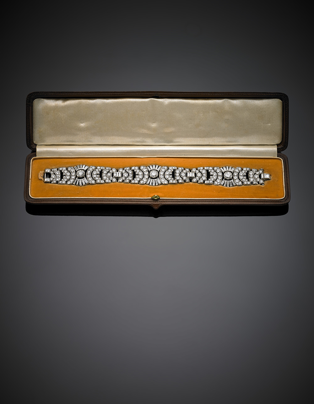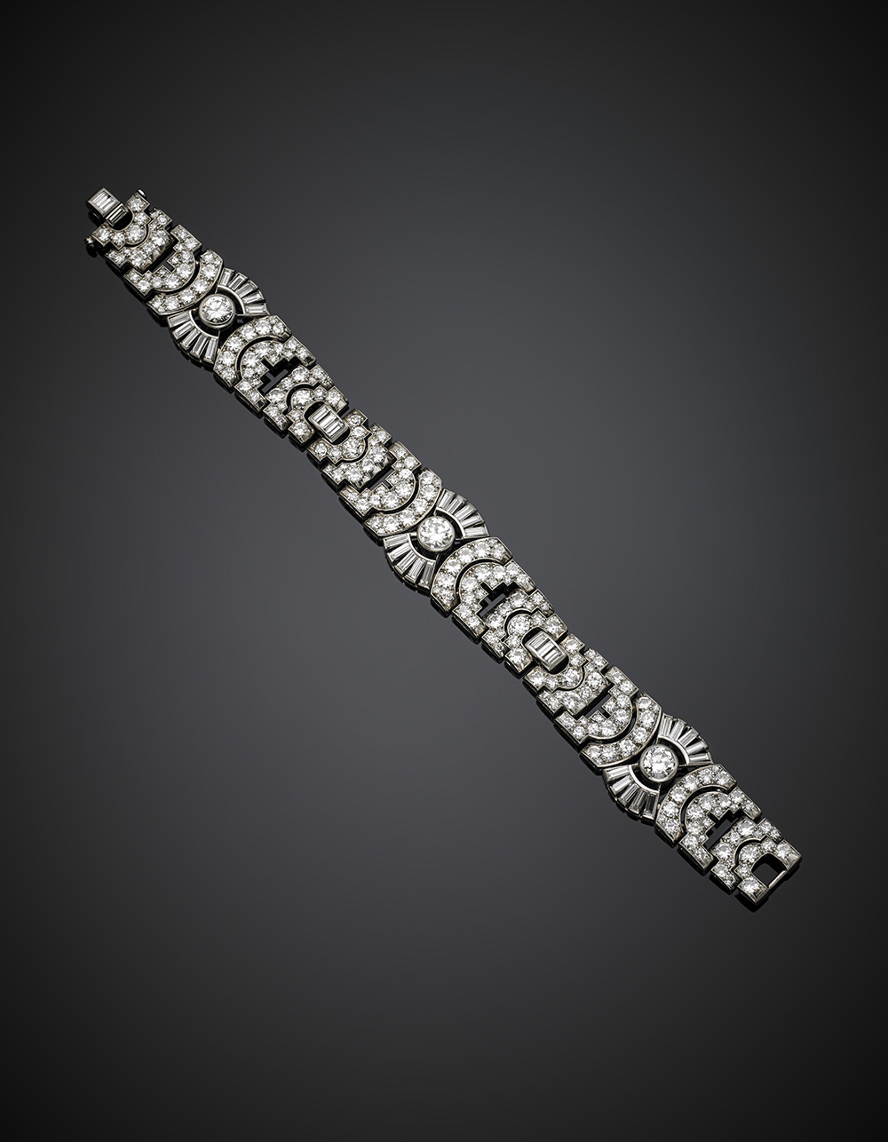 Bracciale modulare, geometrico in platino, diamanti rotondi e a baguette per complessivi ct. 21 circa, g 48,42,