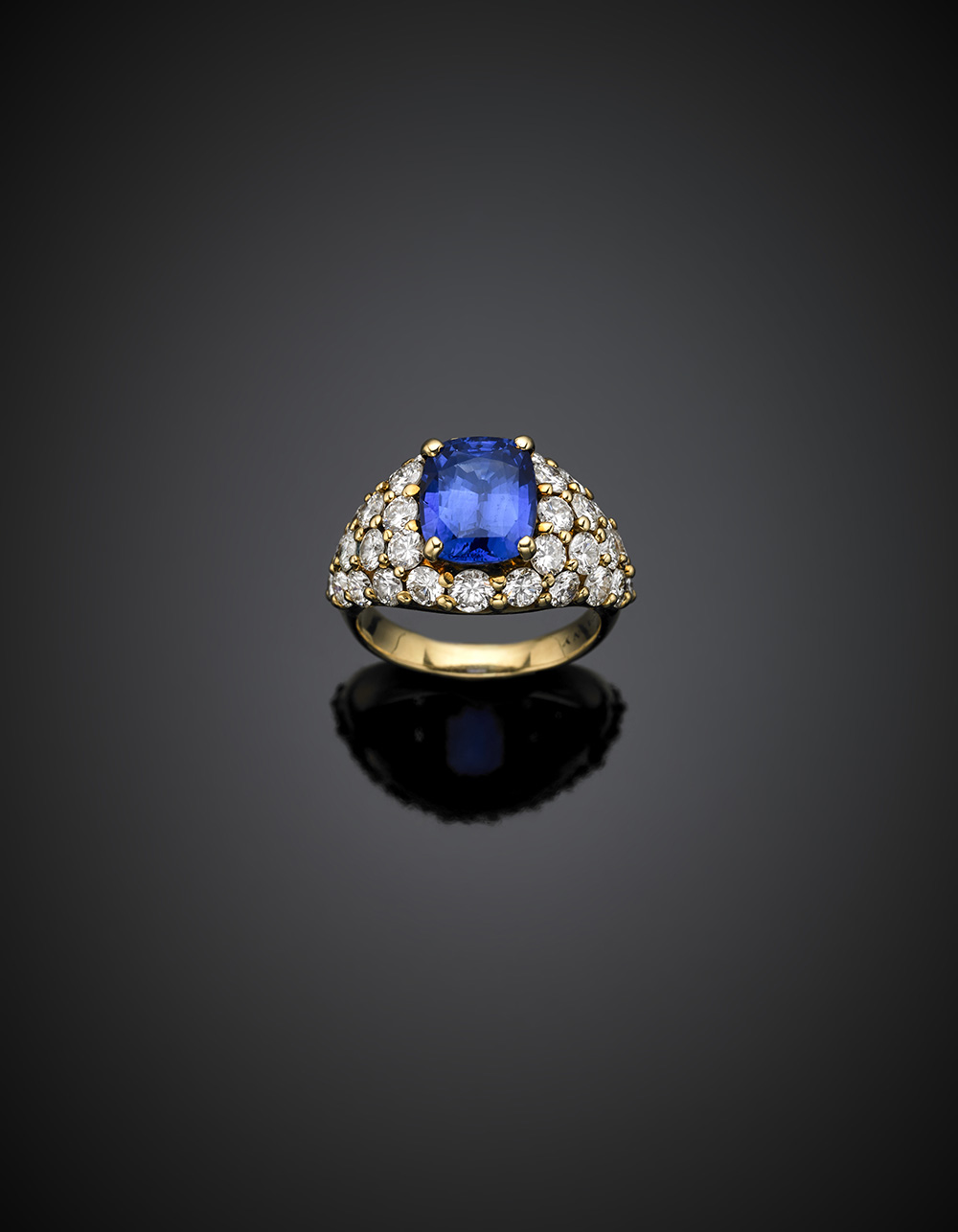 Yellow gold diamond pavé in all ct. 3.20 circa and cushion cut ct. 3.43 circa sapphire ring, g 7.38 size 10/50. Marked VCA NY.