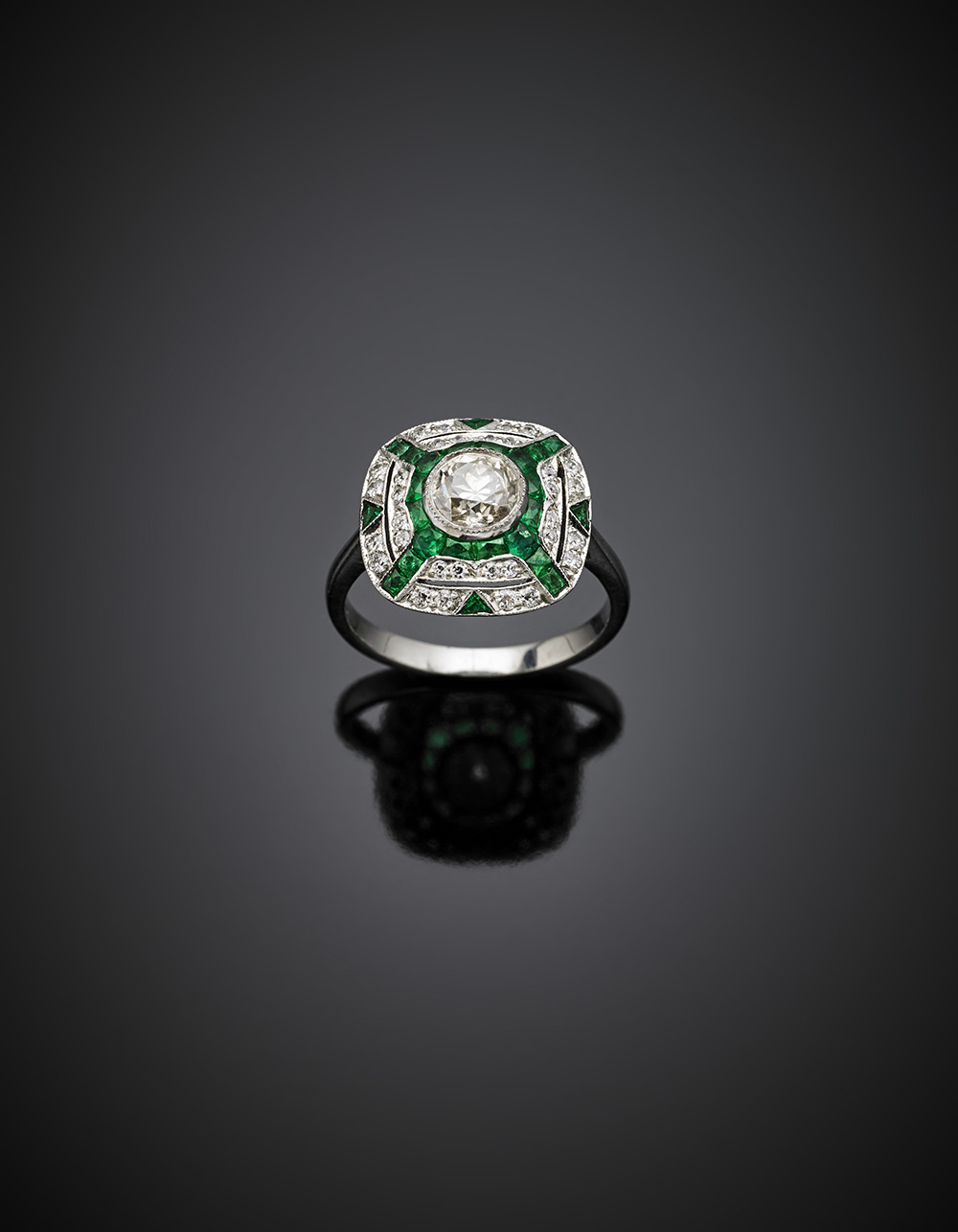 Anello in platino con diamante rotondo di ct. 0,65 circa, smeraldi calibré e diamanti rotondi a rifinirlo, g 5,9 misura 14,5/54,5.