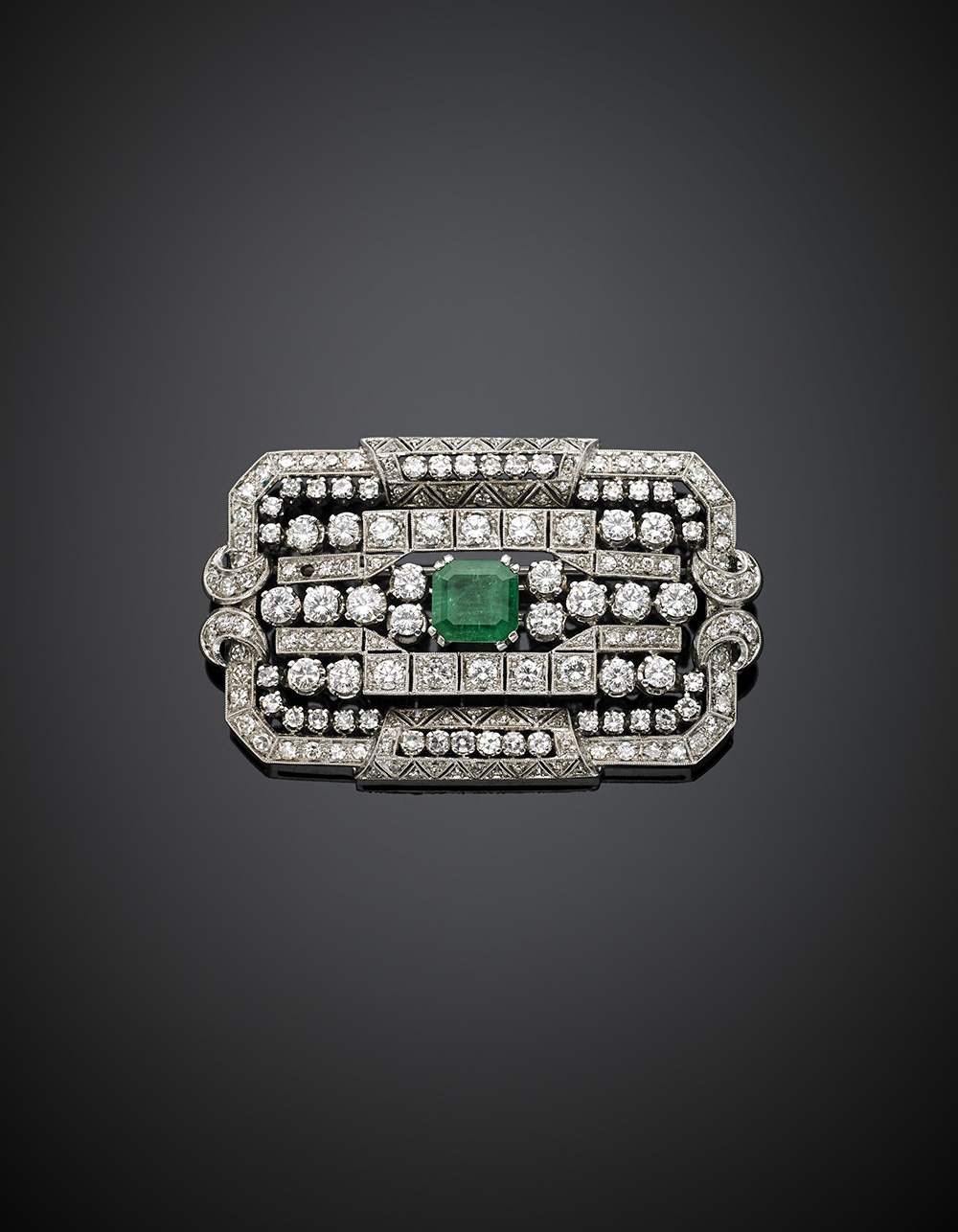 Broche in oro bianco con diamanti rotondi taglio a brillante e huit-huit per complessivi ct. 7,80 circa e smeraldo ottagonale di ct. 6,50 circa, g 32,88, lungh. cm 6,2, largh. cm 3,8 circa. In scatola della Gioielleria Milani (mancanze)