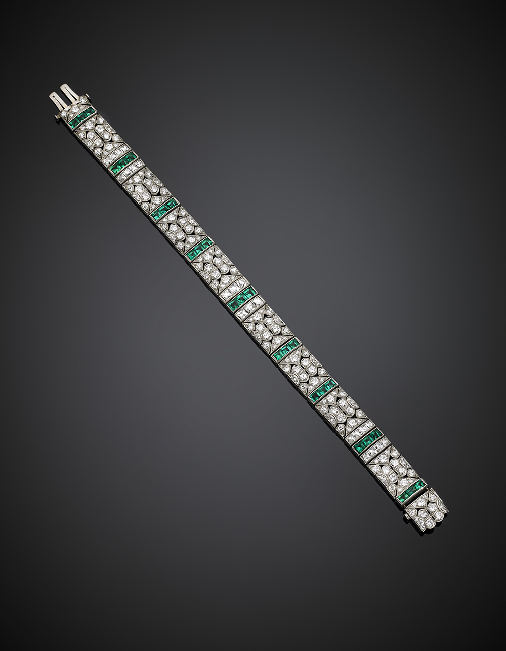 Bracciale modulare in oro bianco con diamanti rotondi e carré per complessivi ct. 6 circa rifinito con smeraldi carré per complessivi ct. 3 circa, g 42,58, lungh. cm 19,5 circa. Marchi parigini di importazione da paesi non contraenti, n° 1214.
