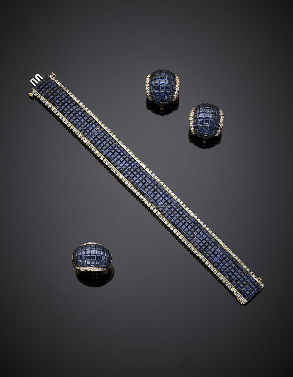 Yellow gold jewelry set comprising bracelet, earrings and ring with mystery set carré sapphire in all ct. 43 circa