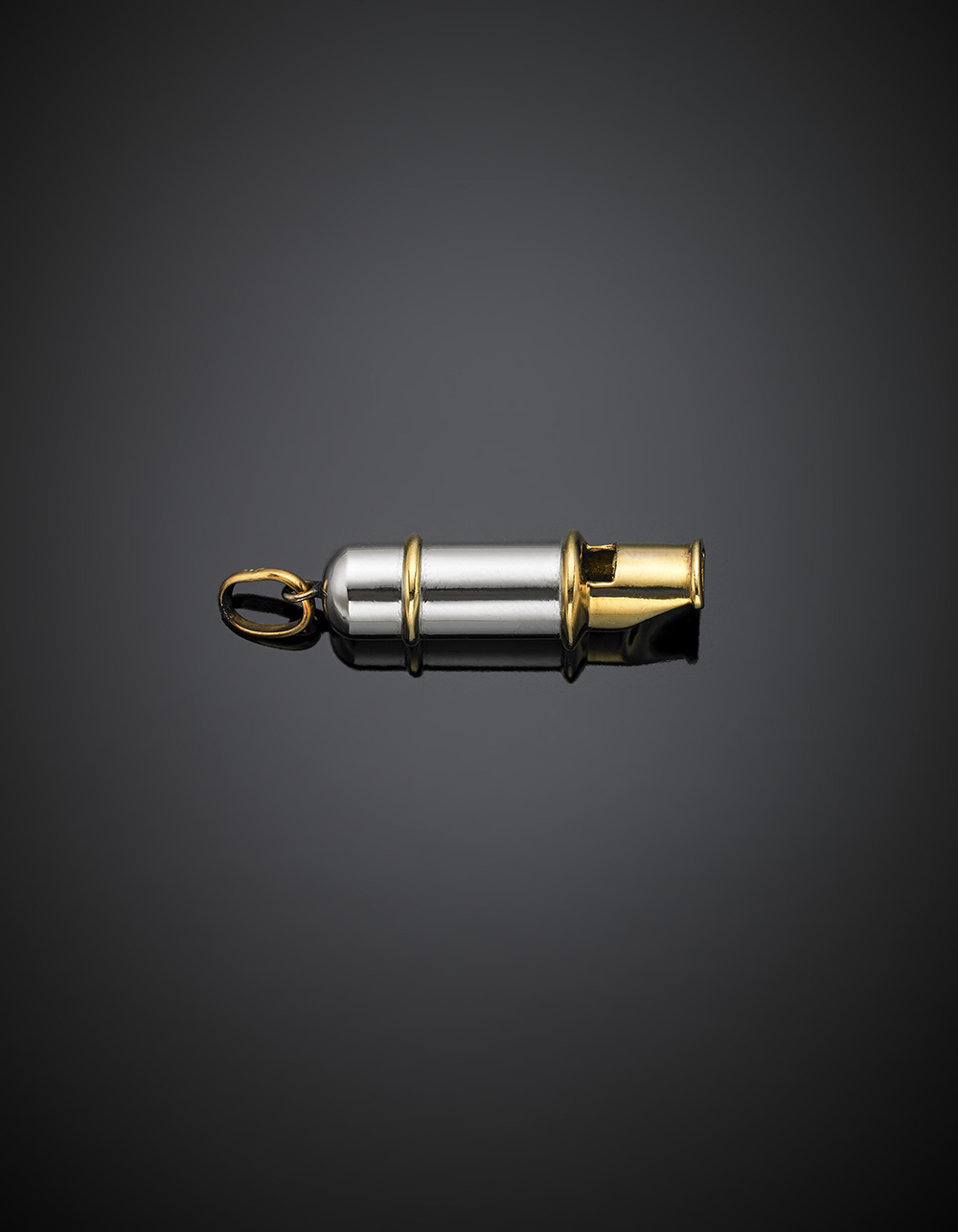 Fischietto in acciaio e oro giallo a guisa di pendente, g 15,31, lungh. cm 5 circa.