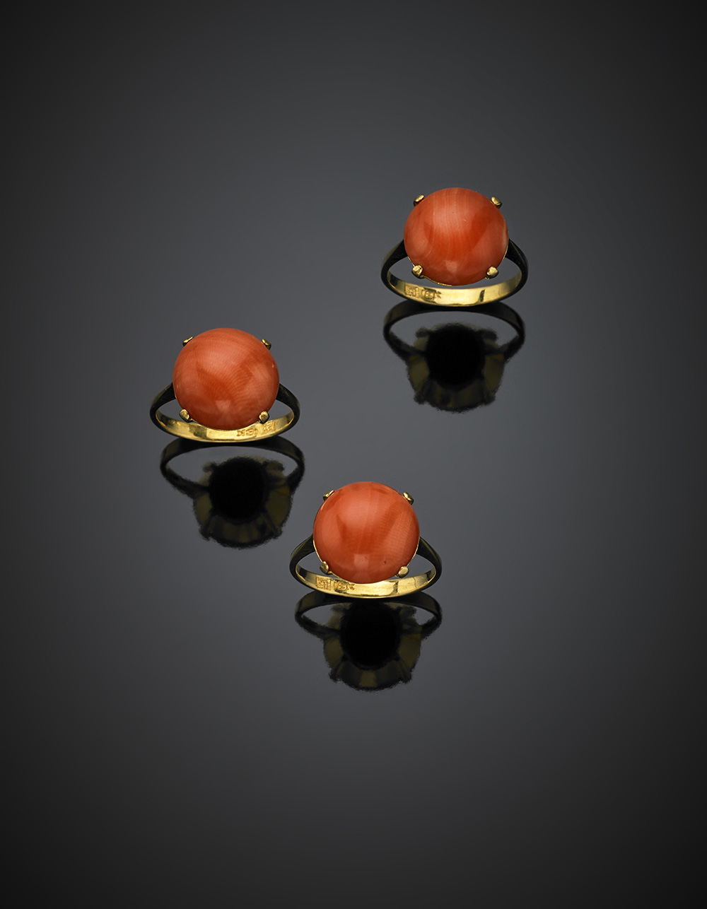 Lotto di tre anelli in oro giallo e corallo arancione, complessivi g 13.