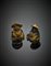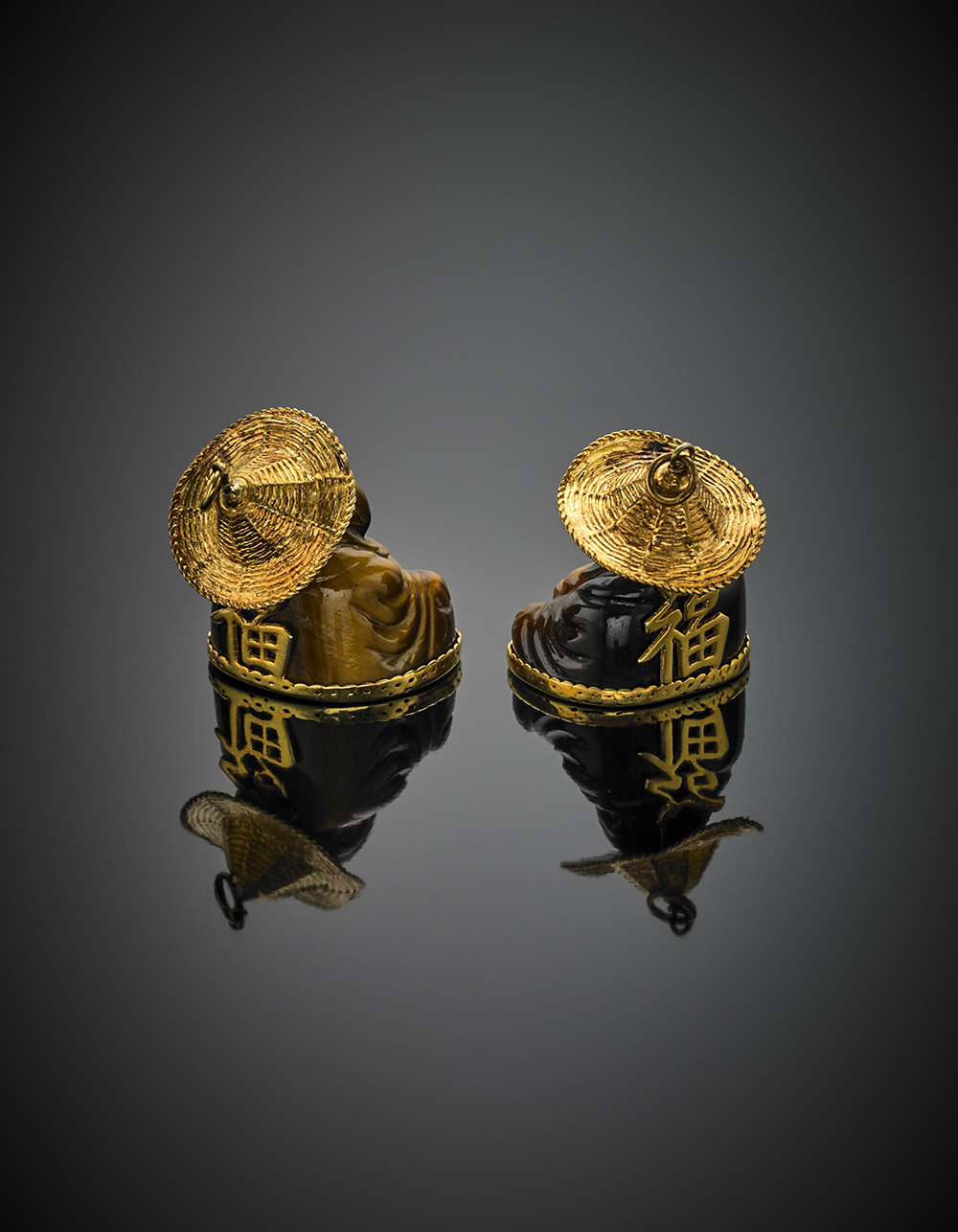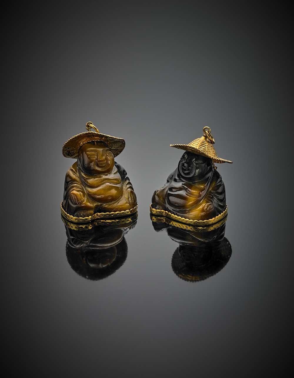 Due pendenti in oro giallo 585/1000 con occhio di tigre scolpito a guisa di Buddha, complessivi g 16,87.