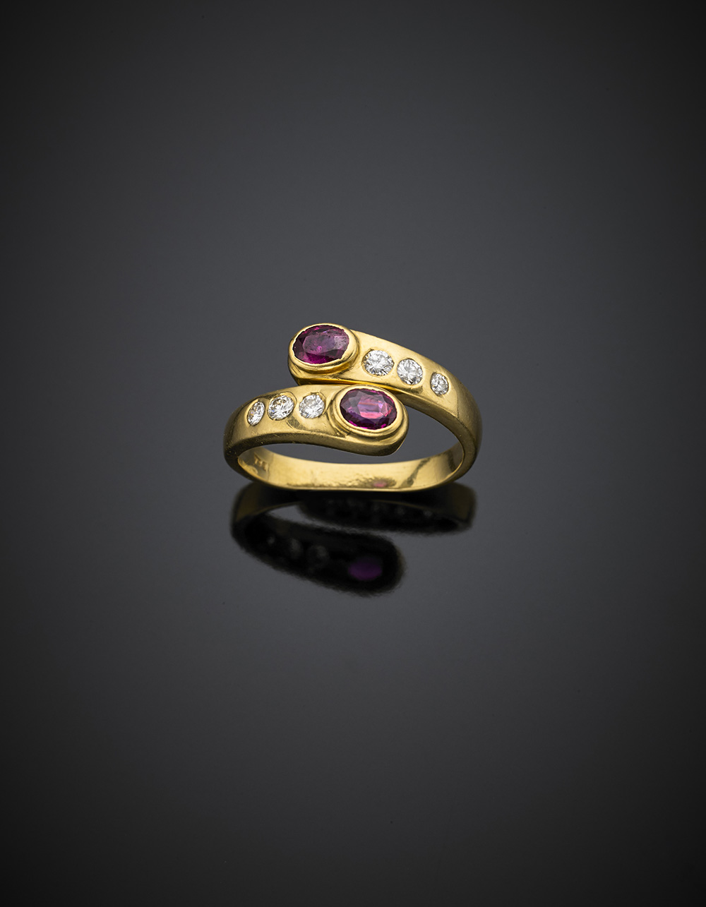 Ruby and diamond yellow gold crossover ring, g 5.58 size 13/53.
