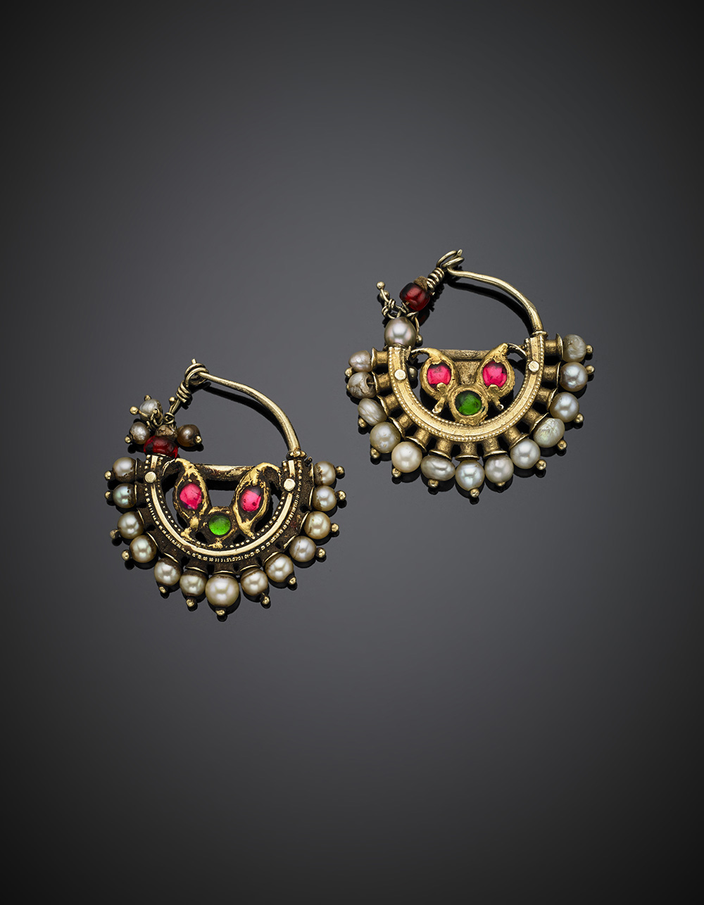 Yellow 9K gold earrings/nose rings with pearls, synthetic rubies and paste, g 5.29, length cm 2.5 circa. (defects)