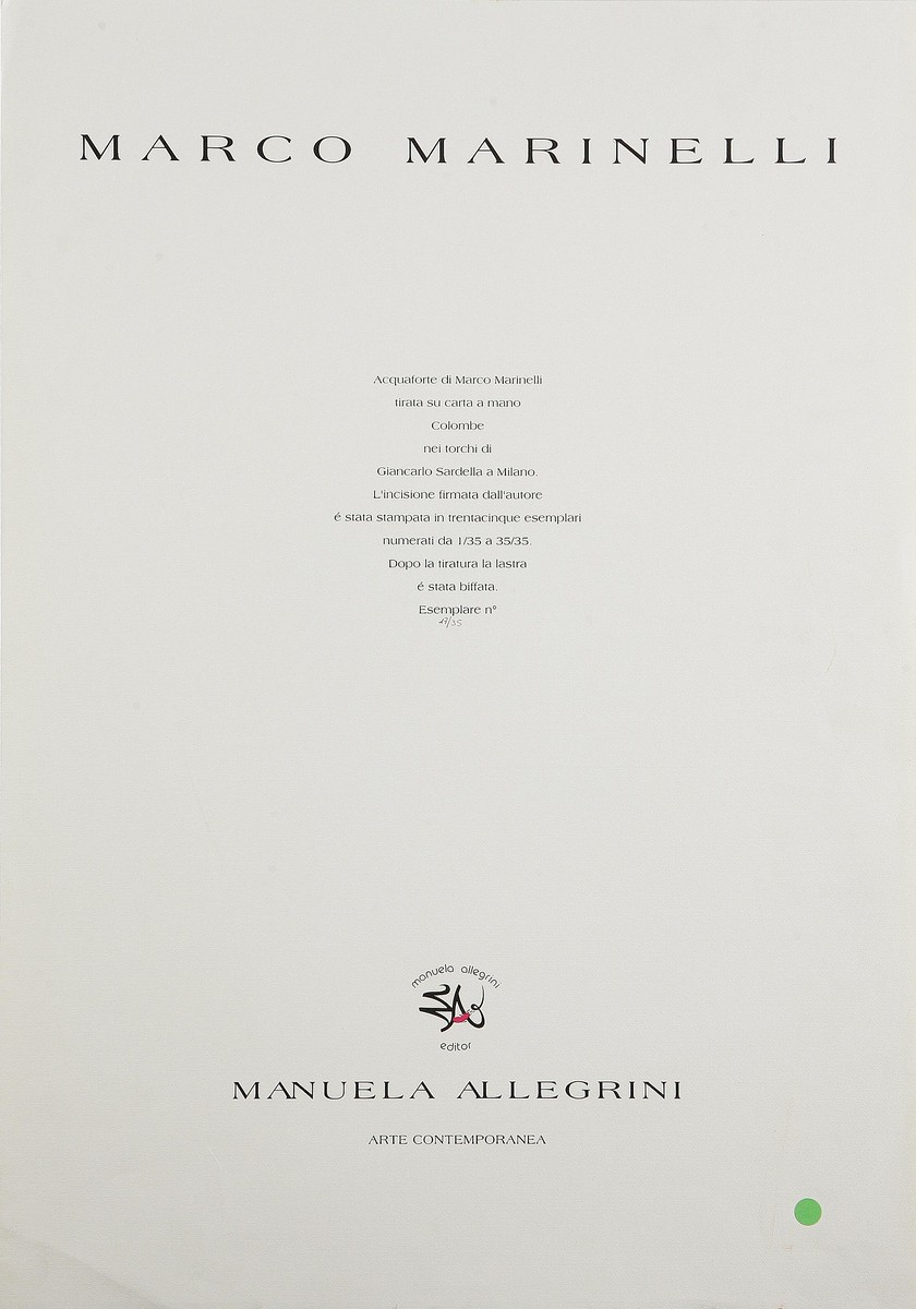 MARINELLI MARCO (n. 1963) Senza titolo. Acquaforte tirata su carta a mano. Cm 44x62. Tir. 17/35 a matita in basso a sinistra, dopo la tiratura la lastra è stata biffata, timbro a secco Manuela Allegrini Editor in basso a sinistra, timbro a secco Giancarlo Sardella Milano in basso a destra. Firma a matita in basso a destra.
