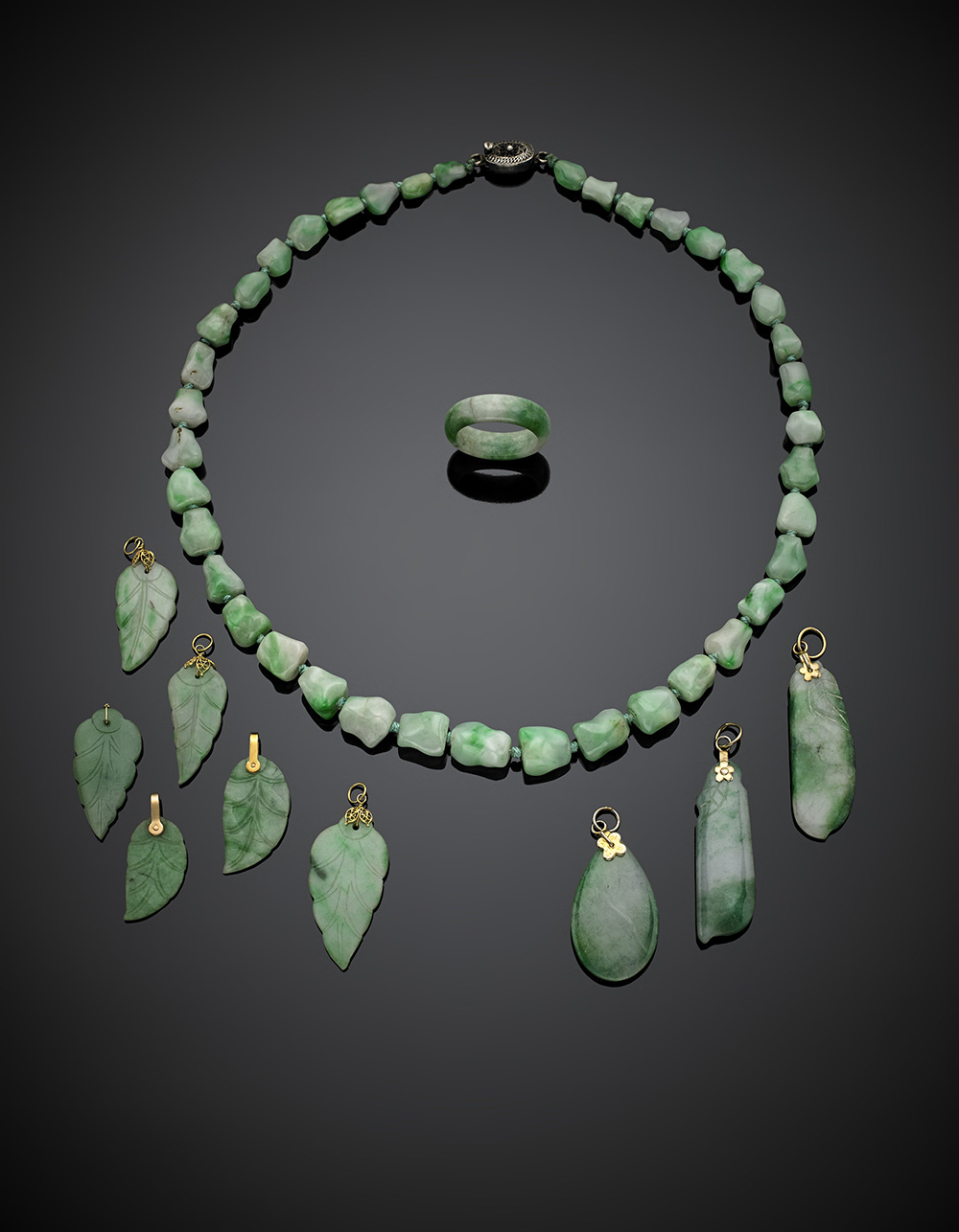 Jadeite lot comprising nine leaf pendants, a necklace and a ring, yellow gold details, in all g 71.60.
