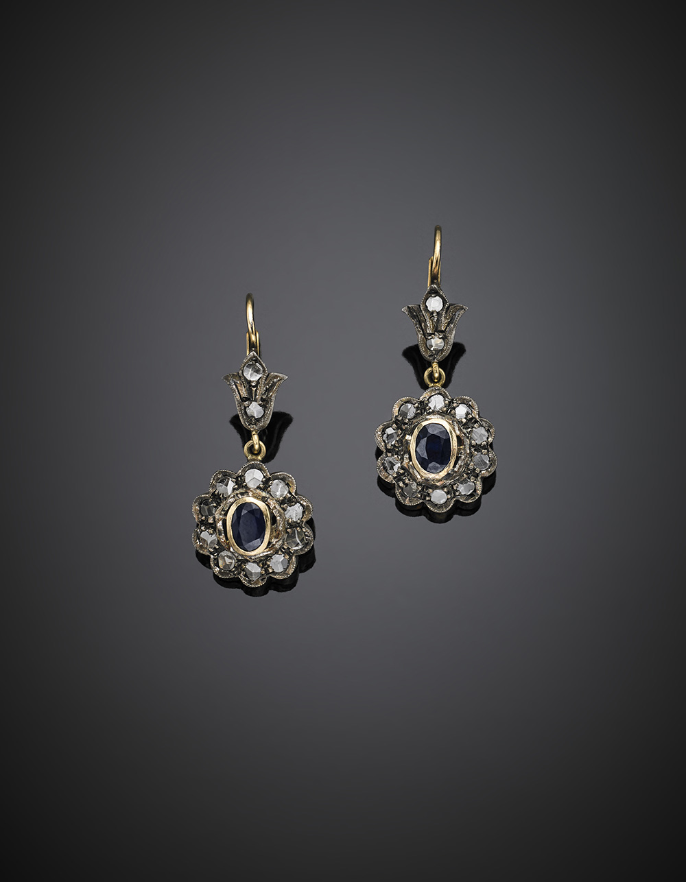 Yellow gold and silver, rose cut diamond and sapphire pendant earrings, g 7.36, length cm 3.5 circa. 551 FI.
