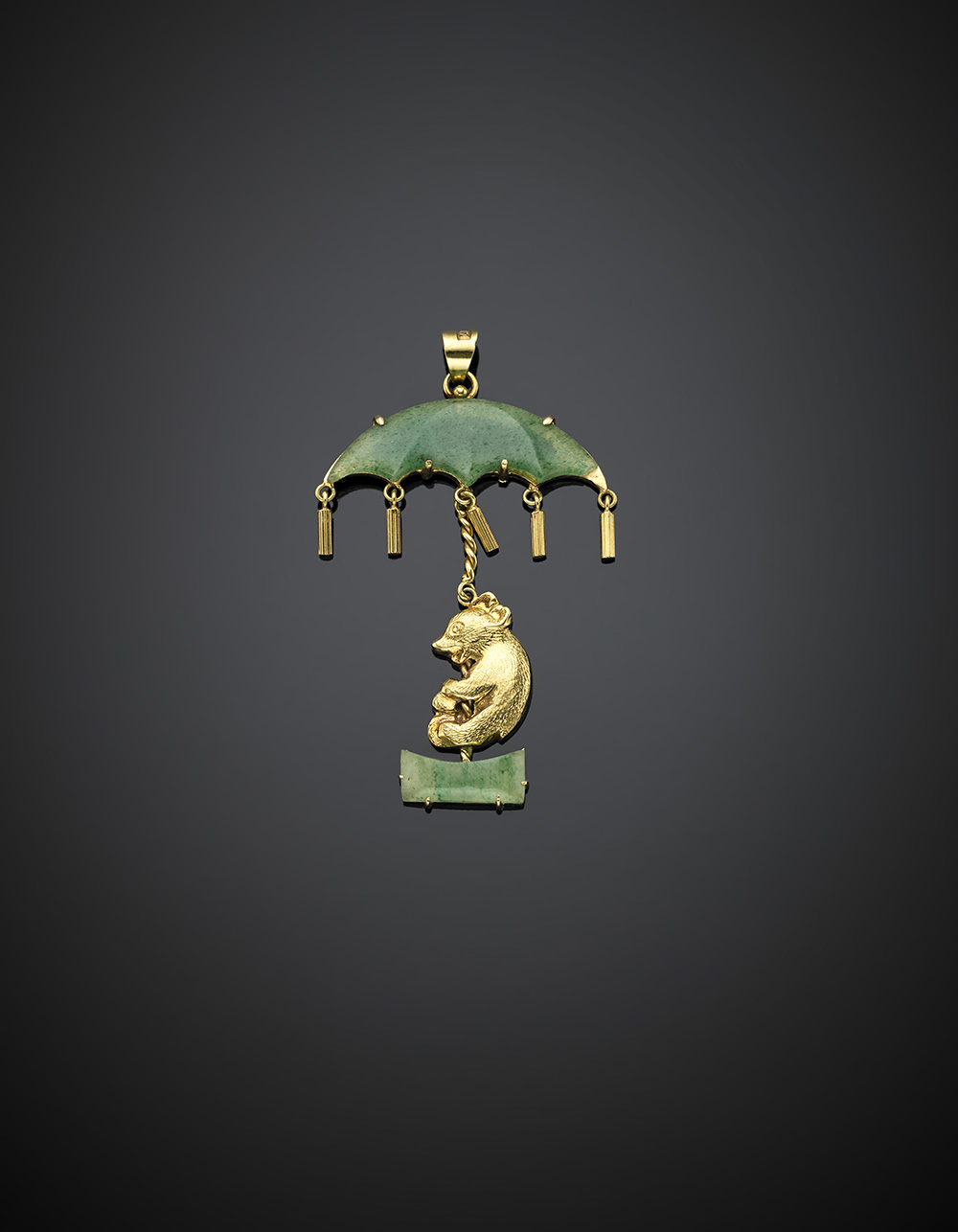 Lot 1039 | Pendente in oro giallo 585/1000 e giada a guisa di panda con ombrellino, g...