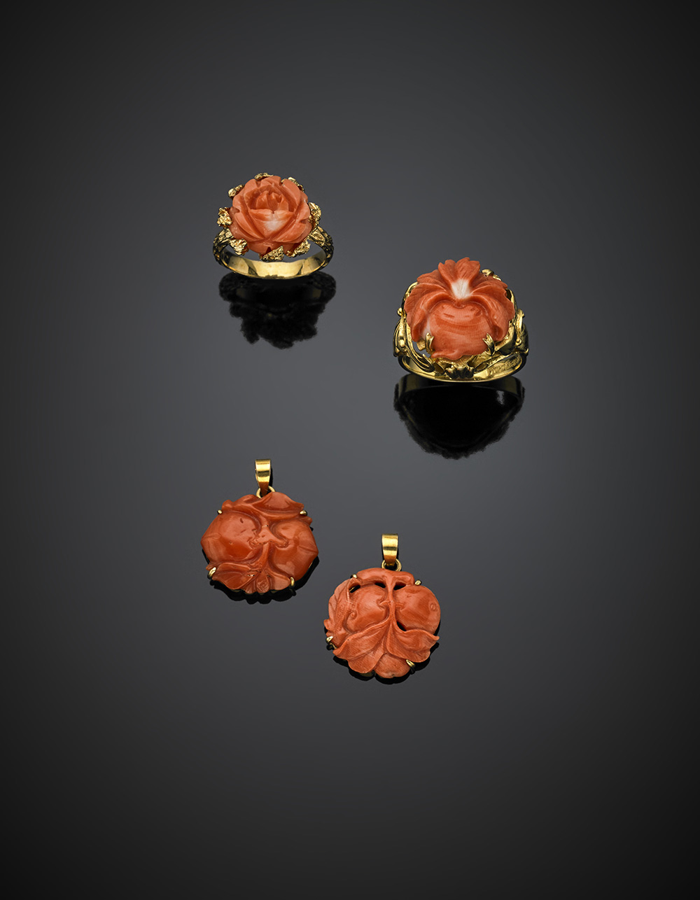 Lotto in oro giallo 750/1000 e 585/1000 con corallo arancione scolpito, composto da due 2 anelli e due pendenti, complessivi g 18,67.