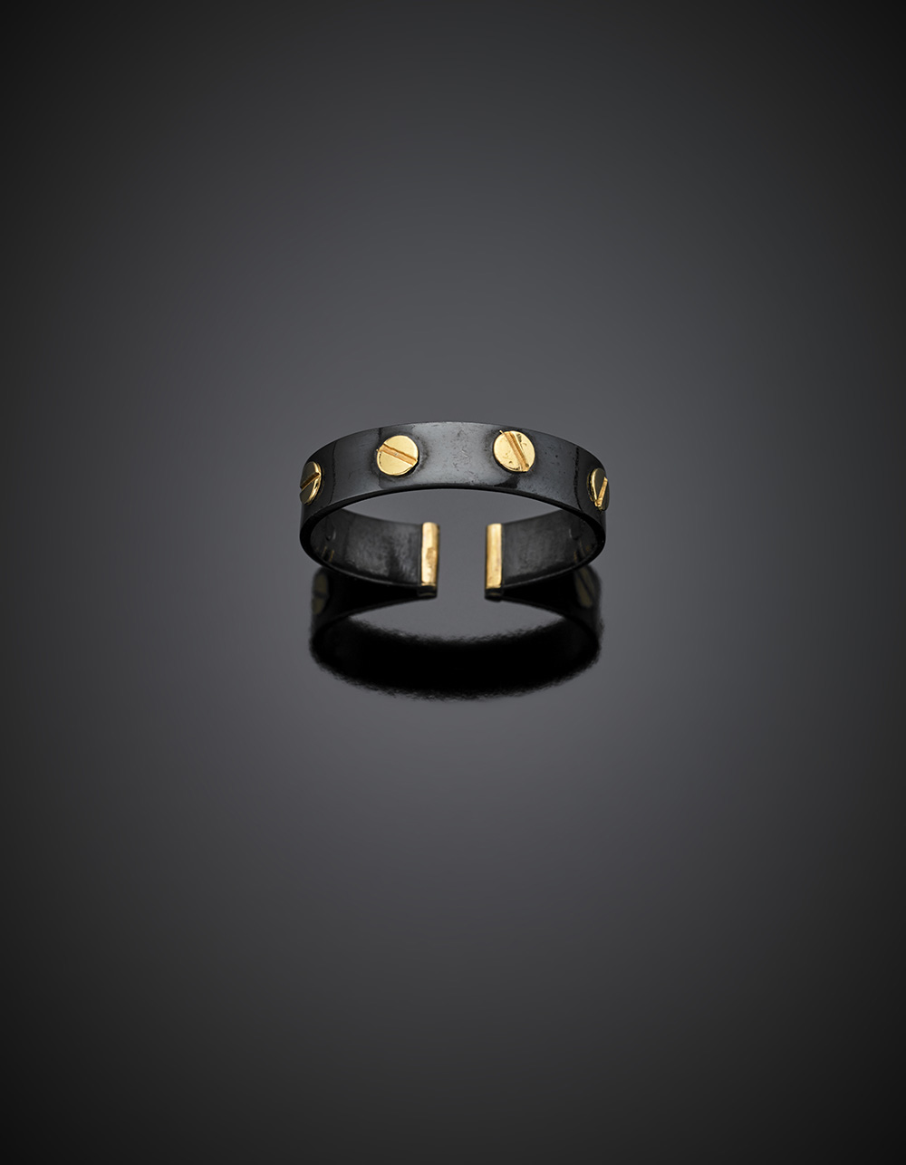 Anello in acciaio brunito e viti in oro giallo, g 2,27.-ENBlack steel and...