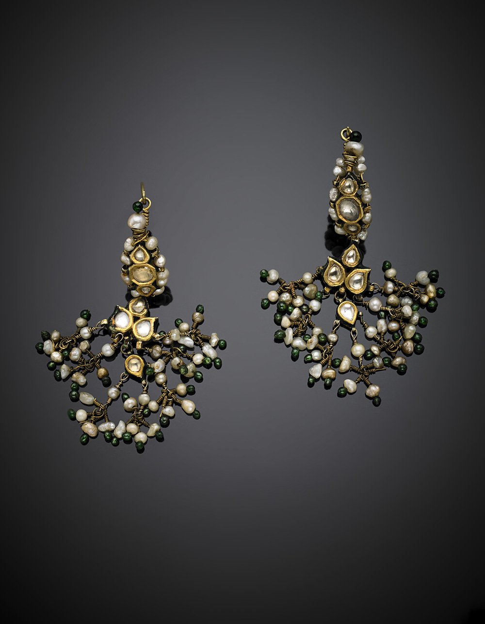 Orecchini pendenti a nappa in oro giallo e metallo con pietre incolori, perle, paste vitree verdi e smalti , g 17,3, lungh. cm 7,5 circa. (difetti)