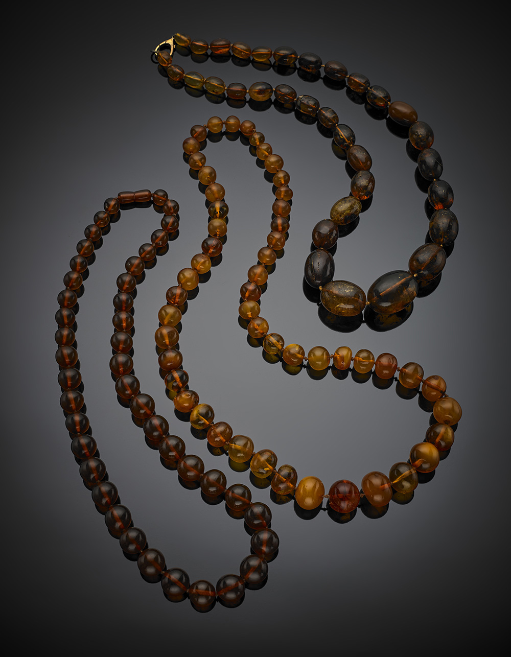 Lotto di tre collane in ambra a scalare con boules da mm 11,00 a mm 27,00 circa con diverse trasparenze e di diverse lunghezze, complessivi g 316,43.