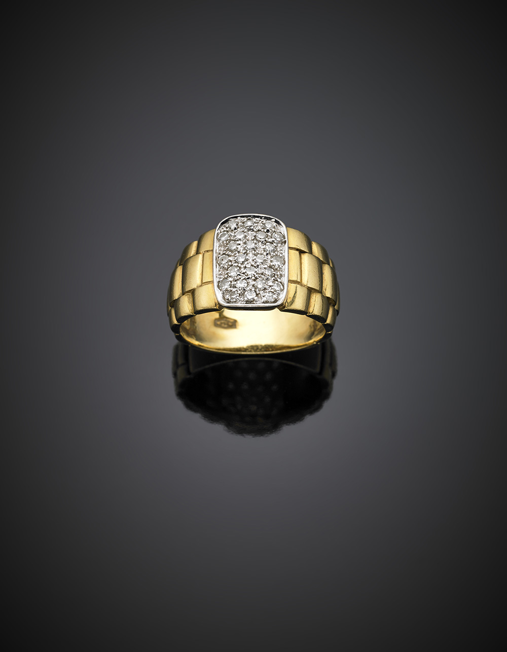 Anello a fascia in oro giallo con piccolo pavè di diamanti per complessivi ct. 0,40 circa, g 8,6 misura 14,5/54,5.