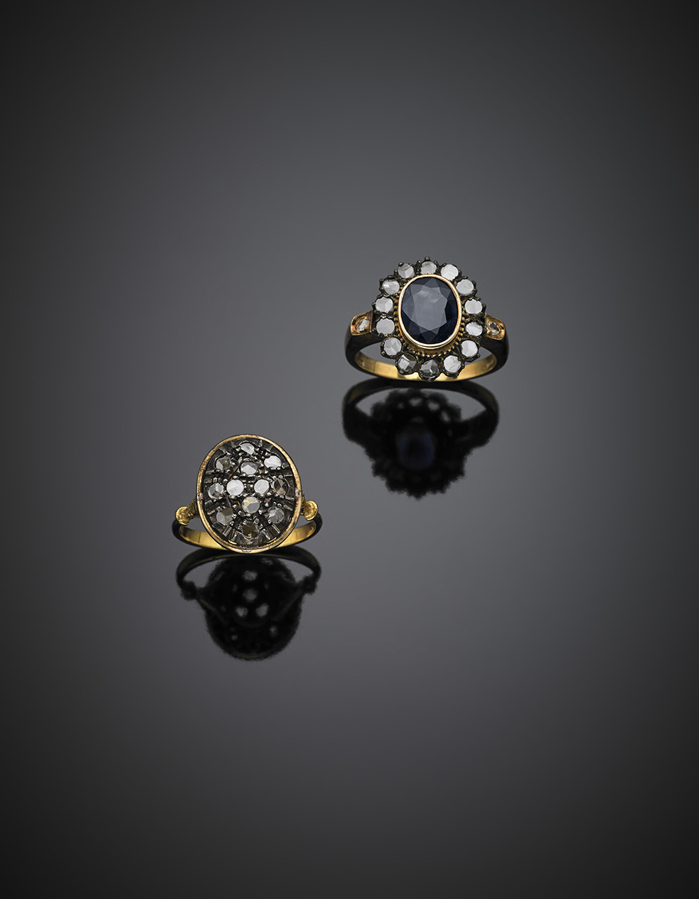 Lotto di due anelli in oro giallo, argento, diamanti e zaffiri, complessivi g...