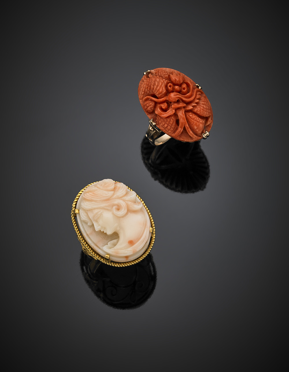 Lotto composto da due anelli in oro giallo e coralli rosa e arancione scolpiti, complessivi g 20,75 misura 14/54, 18/58.